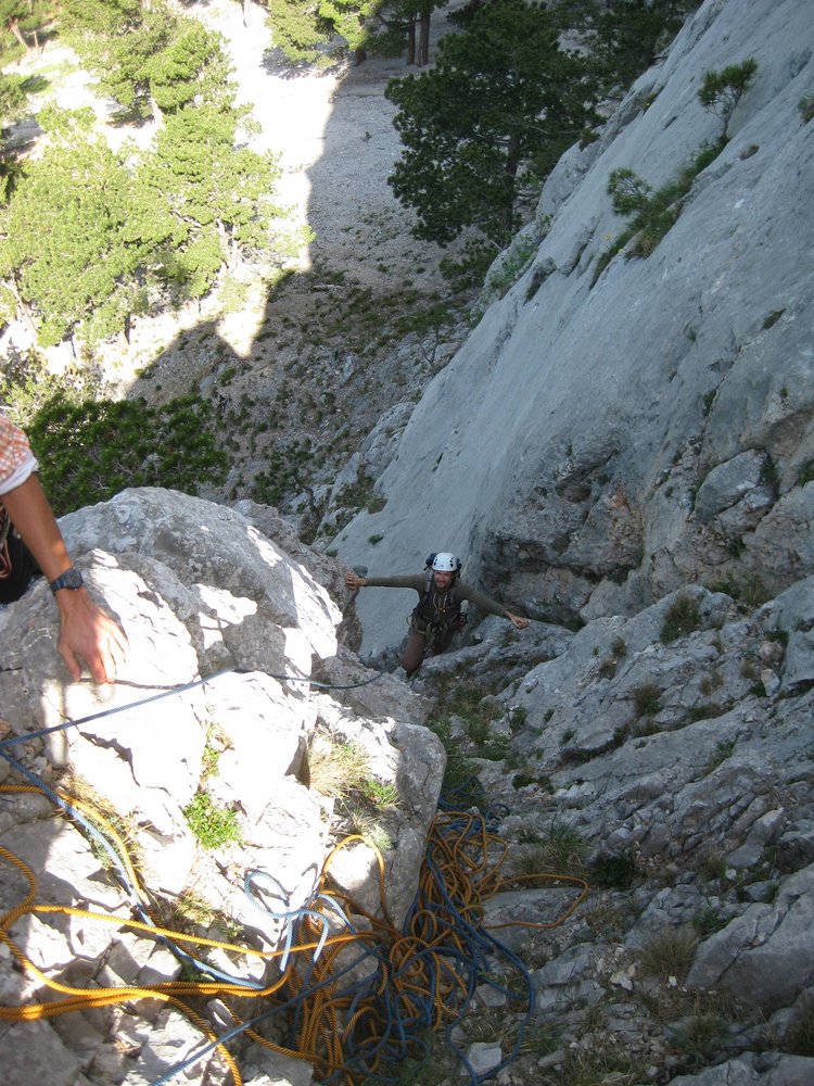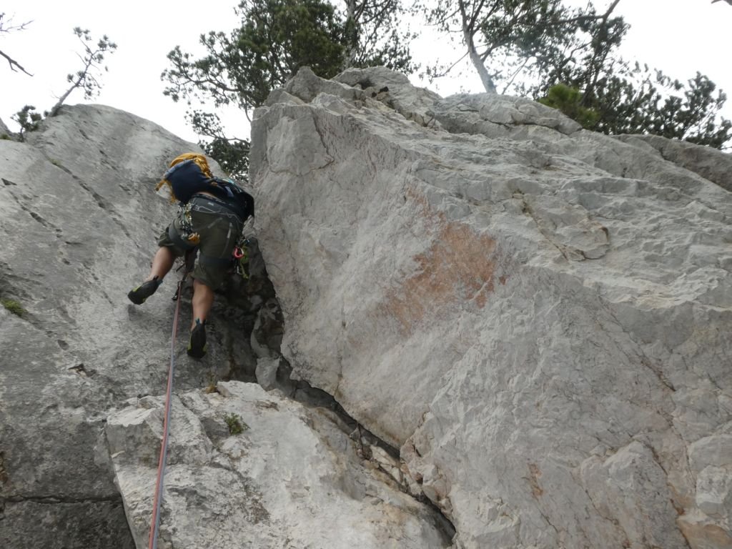 Die schwierigen Stellen sind gut mit Sanduhren, Normalhaken und einigen Bohrhaken abgesichert, dazwischen sind Friends gut verwendbar. Stände meist an Bäumen. Die letzte kurze Seillänge muss mit Friends selbst abgesichert werden (kann auch rechts umgangen werden).