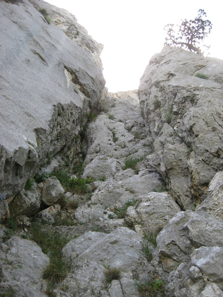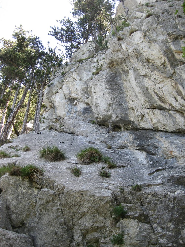 Am Wandfuß nach rechts bis zum zweiten Schuttrücken. 8 m rechts davon ist der Einstieg (am rechten Rand der steilen Plattenwand von „Kopfgeld“).