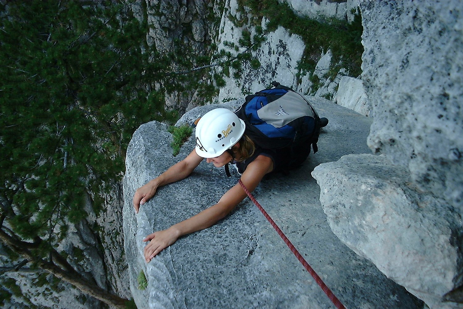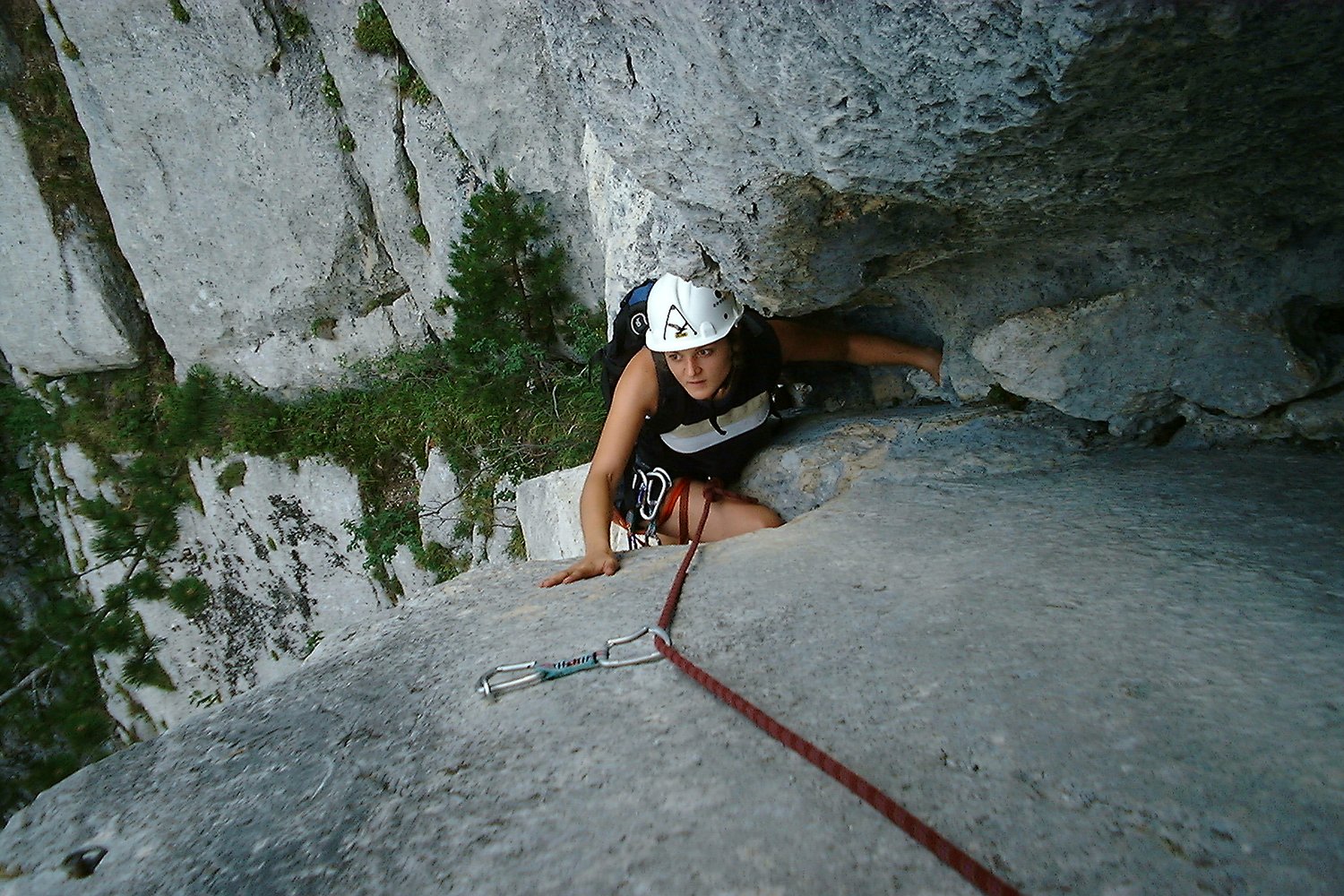 Grosser Rax Klassiker, der trotz des schon etwas abgekletterten Fels, sicher eine Begehung wert ist. Die Route wurde mit Klebehaken saniert (nur die Stände und ab und zu ein Bolt dazwischen, vielen Dank an den OETK!). Die Schlüsselstelle bildet eine überdachte Plattenrampe, bei der auch gute Kletterer kurz überlegen müssen bevor sie "durchstarten". Am Schluss kommt noch ein netter Spreizschritt über ein Schartl. Vorsicht, im Wachthüttelgraben herrscht akute Steinschlaggefahr, am besten den Helm schon vor dem Wandfuss (grosse Nische) aufsetzen. Insgesamt ein schönes Erlebnis in dieser Schwierigkeit.