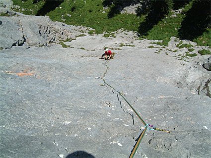 Abseilen oder auf Grasband nach links zu einer Rinne und über diese Ausstiegen (II). Bzw. kann man noch oben links der Rinne Touren anhängen (siehe Topo).