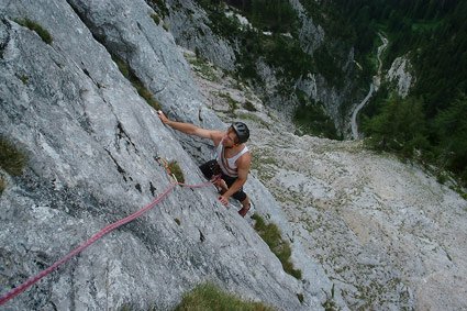 Vom Bodenbauer auf Forstweg Richtung „Josersee“ und nach ca. 45 min (nach einigen Häusern) der Straße Richtung „Klamm Tragöss“ (nicht Josersee) auf den Scheidecksattel (davor gr. Wiese) folgen. Nun ca. 200 m absteigen und kurz nach einem verfallenen alten Holzzaun links in den Graben (Steigspuren, Steinmann). Auf diesen Steigspuren links in den Wald und über eine Rinne. Danach absteigen und zur 2. Schuttrinne mit darüberliegender markanter Höhle queren. Unter der Höhle querend wieder in den Wald und zum Geröllfeld unter der Wand aufsteigen. 1,5 Std.