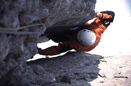 Vom Stand gerade einen Riss empor (1H, IV) an die Kante, nun links hinaus und ausgesetzt mit Hilfe der Kante zum Beginn eines überhängenden Risses (2H, V+ oder V/A0) und in ihm hinauf (1H, erst V, dann leichter) und rechts hinaus zu Stand,