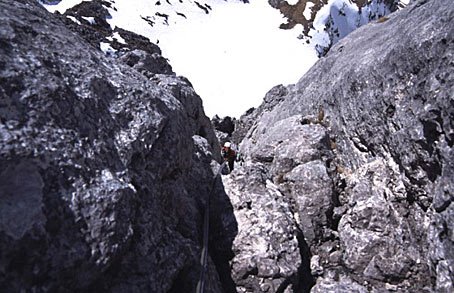 Vom Stand die Schlucht rechts empor bis zu BH (Ringhaken, man kann auch hier Stand machen), 20m II. Nicht weiter die Schlucht hinauf, sondern links über eine gestufte Wand zu Stand bei einem Köpfel direkt an der Kante