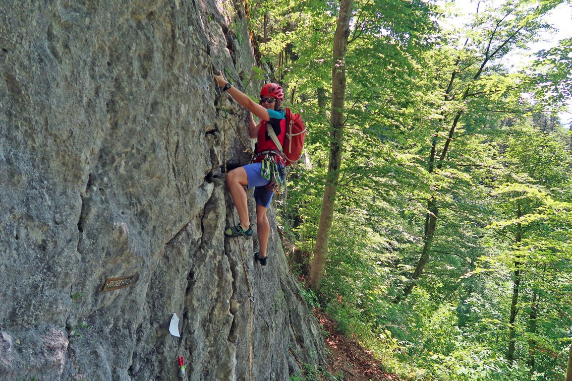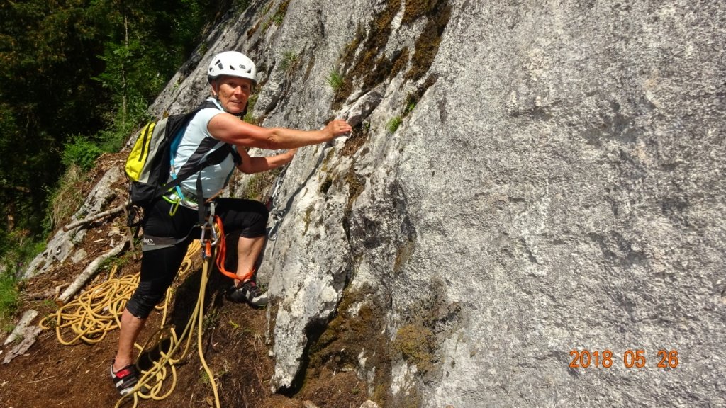 Sehr leichte Genussklettertour wenige Meter rechts der beliebten Route "Clou". Die Route wurde von den Erstbegehern in mühevoller Arbeit quasi ausgegraben - entstanden sind ein paar nette Kletterpassagen, welche immer wieder von Absätzen unterbrochen werden. Die Tour ist gut abgesichert - sie eignet sich auch für Kletteranfänger. Eine der leichteren Touren am Plombergstein, die - wenn erst einmal etwas abgeklettert - sicher sehr beliebt werden wird.