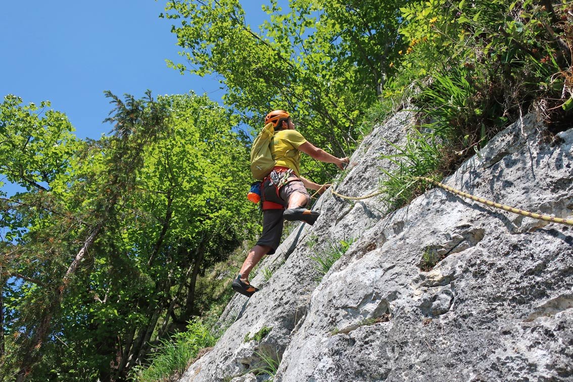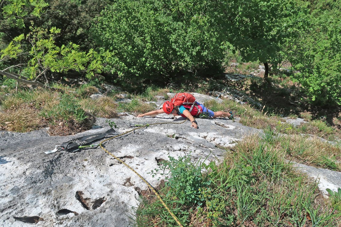 Vom Ausstieg hält man sich links (leicht fallend) immer unterhalb der Felsen bis man nach ca. 200 m auf den Wanderweg im Staffelgraben trifft. Auf diesem zurück zum AV-Klettergarten und von diesem zum Parkplatz.