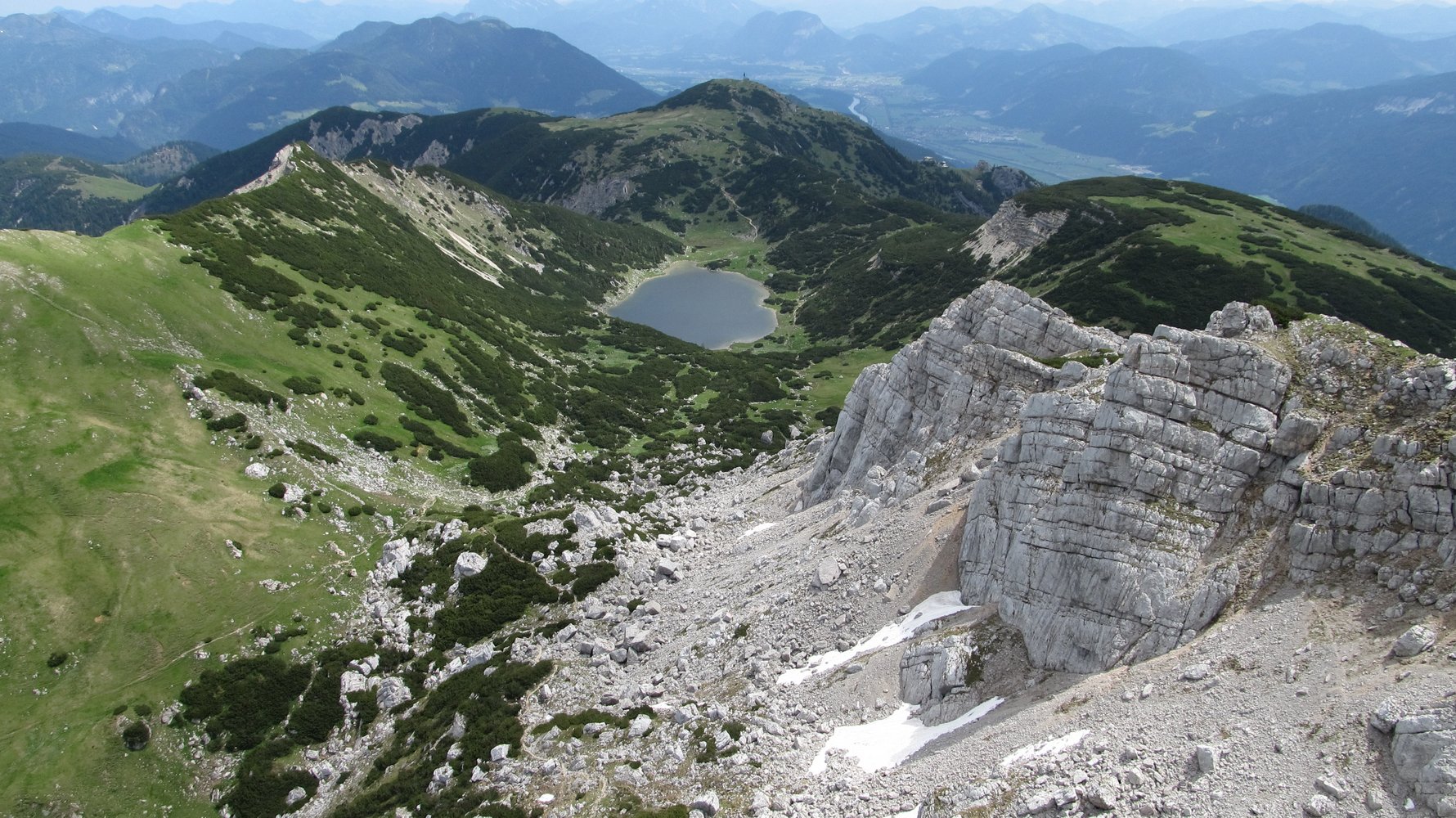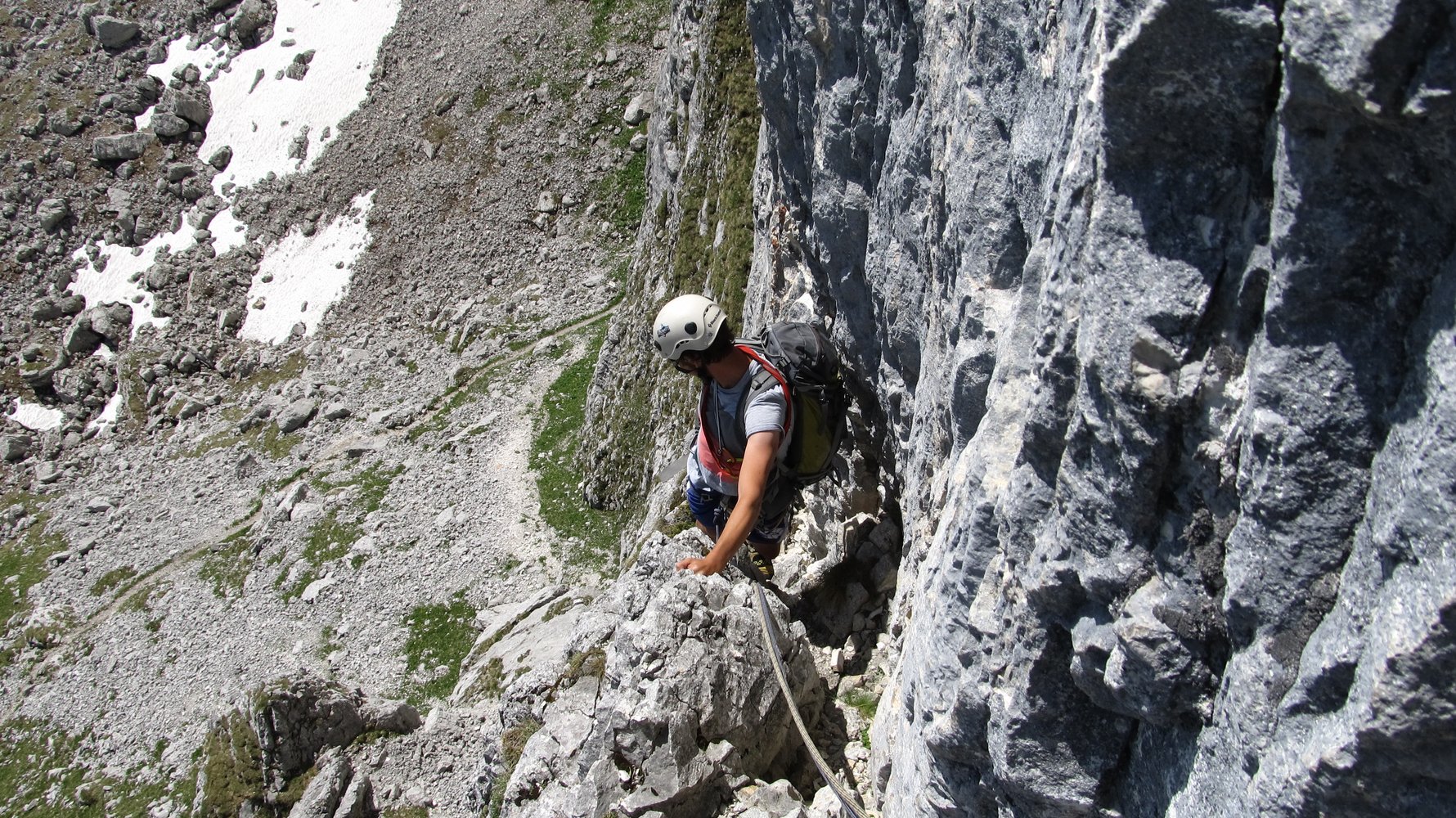 Über die Route abseilen oder über das Grasband (bei Nässe gefährlich) zum Normalweg absteigen und über diesen zurück zum Einstieg.