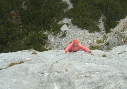 Wunderschöne Plattenkletterei, die oben eine schwere Seillänge hat.