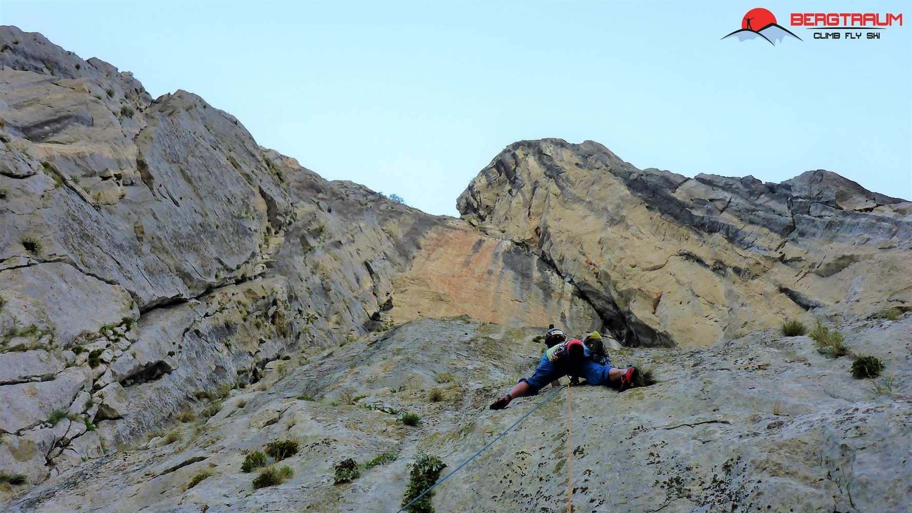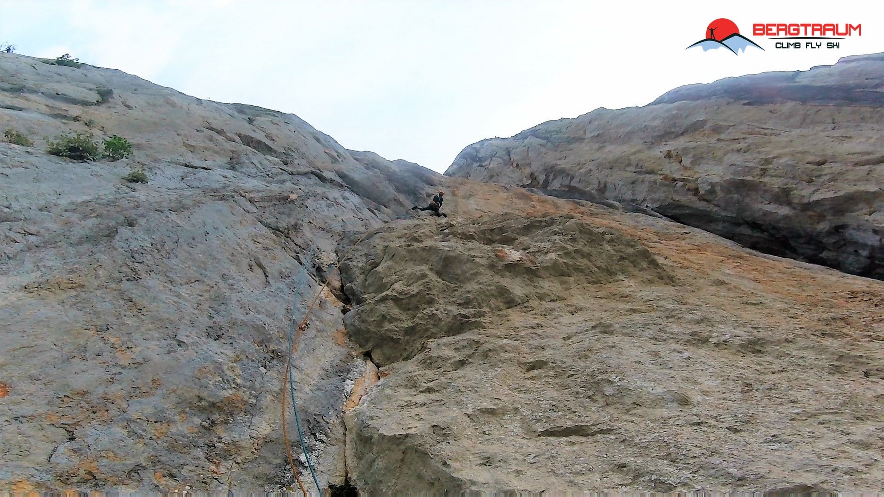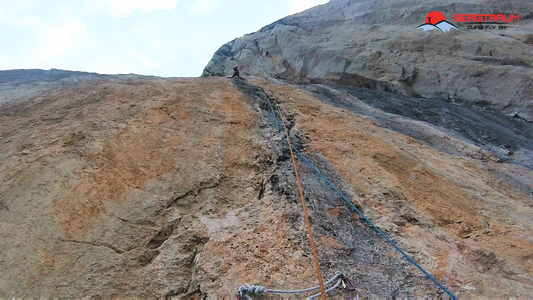 Die ersten zwei Seillängen verlangen gleich mal Eigeninitiative (friends) und ein wenig Gefühl für die Routenwahl. Die dritte Länge führt durch eine markante Verschneidung direkt zur gelben überhängenden Wandflucht. Die 7a beginnt gleich nach dem Standplatz eher links der Verschneidung hoch (eine ganz markante Sinter- Piazplatte) und anschließend fast waagrecht nach rechts unter einem kleinen Dach wieder zu den bolts zurück. Dann ultralässig überhängend an großen Griffen in einem Rechtsbogen zum Standplatz. Die 7c ist kleingriffig und sehr technisch- nicht immer nur direkt den bolts nach, sondern mal leicht links und mal rechts ausweichend den besten Weg suchend rauf. Schlüsselstelle knapp unter dem nächsten Stand. Die nächsten beiden 6a sind großteils selbst abzusichern. Teilweise überhängende Piazkletterei verlangt dort doch ein wenig Moral vom Vorsteiger. Ein bolt da und dort würde keinesfalls schaden. Oben raus wieder Genuss pur!