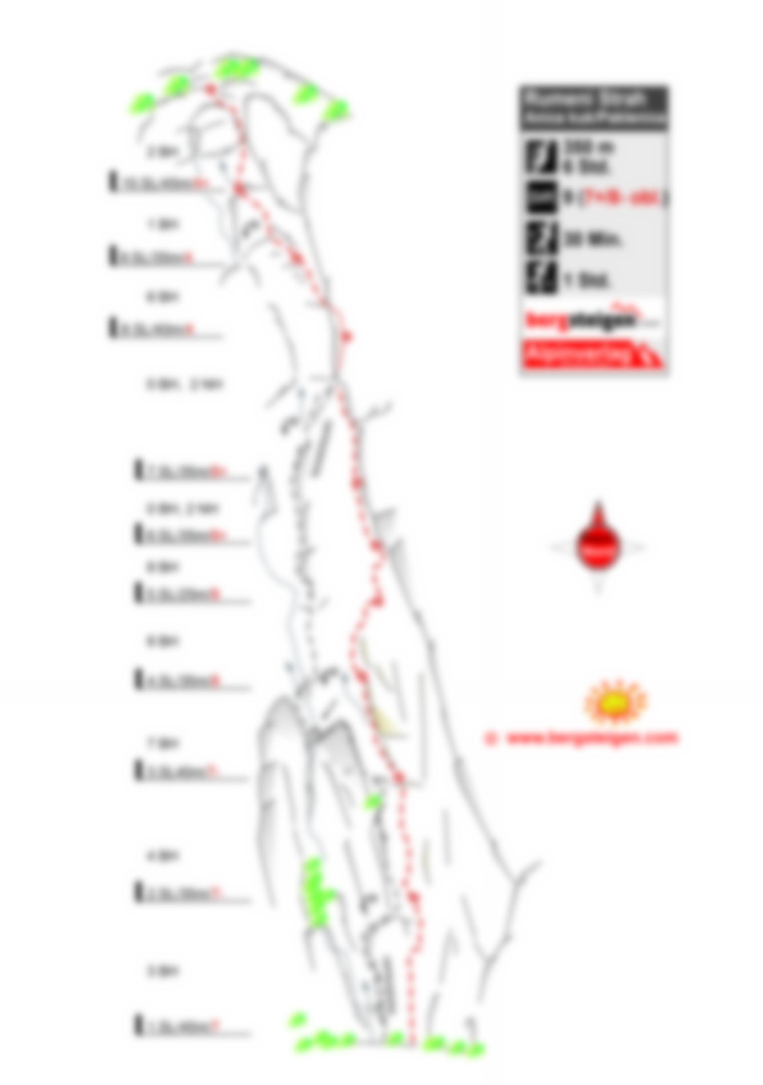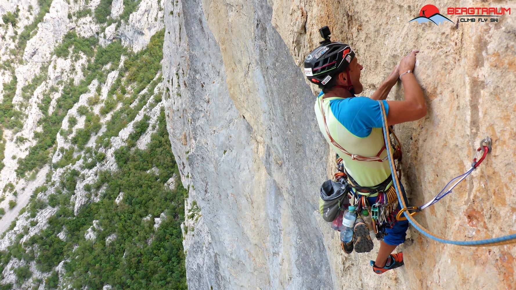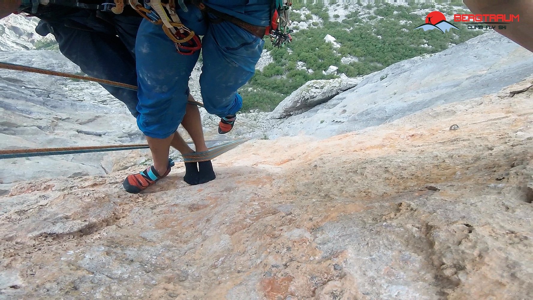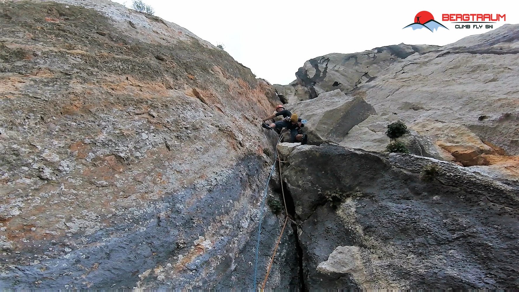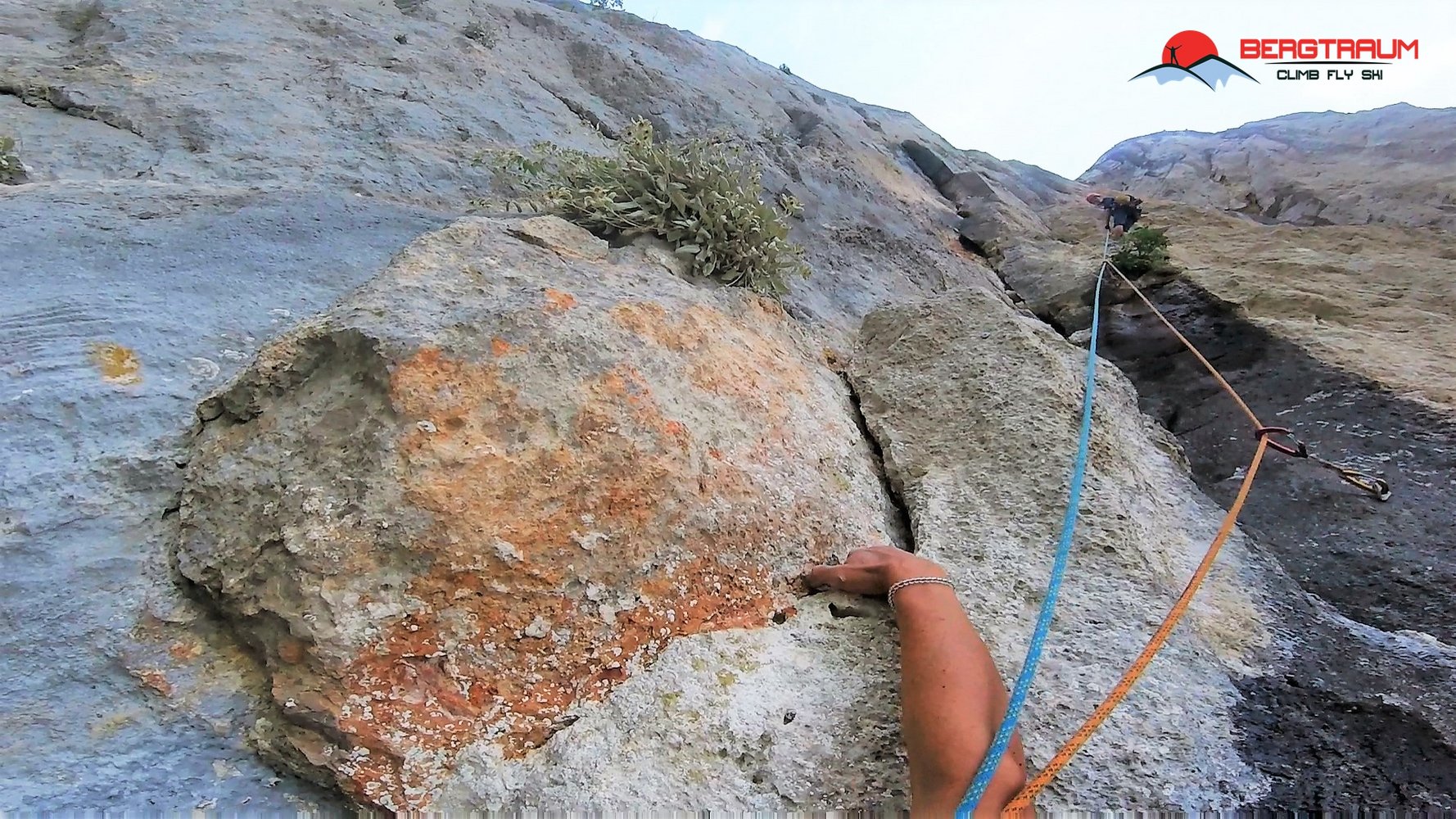 Bis auf die Seillängen 3-5 (da gibt’s gute bolts als Zwischensicherungen) sind alle anderen Längen nichts für schwache Nerven: speziell die oberen beiden 6a- Längen haben außer alten NH und wackeligen Holzkeilen nichts solides zu bieten. Ein Satz friends und lange Sanduhrschlingen sind dort Gold wert!