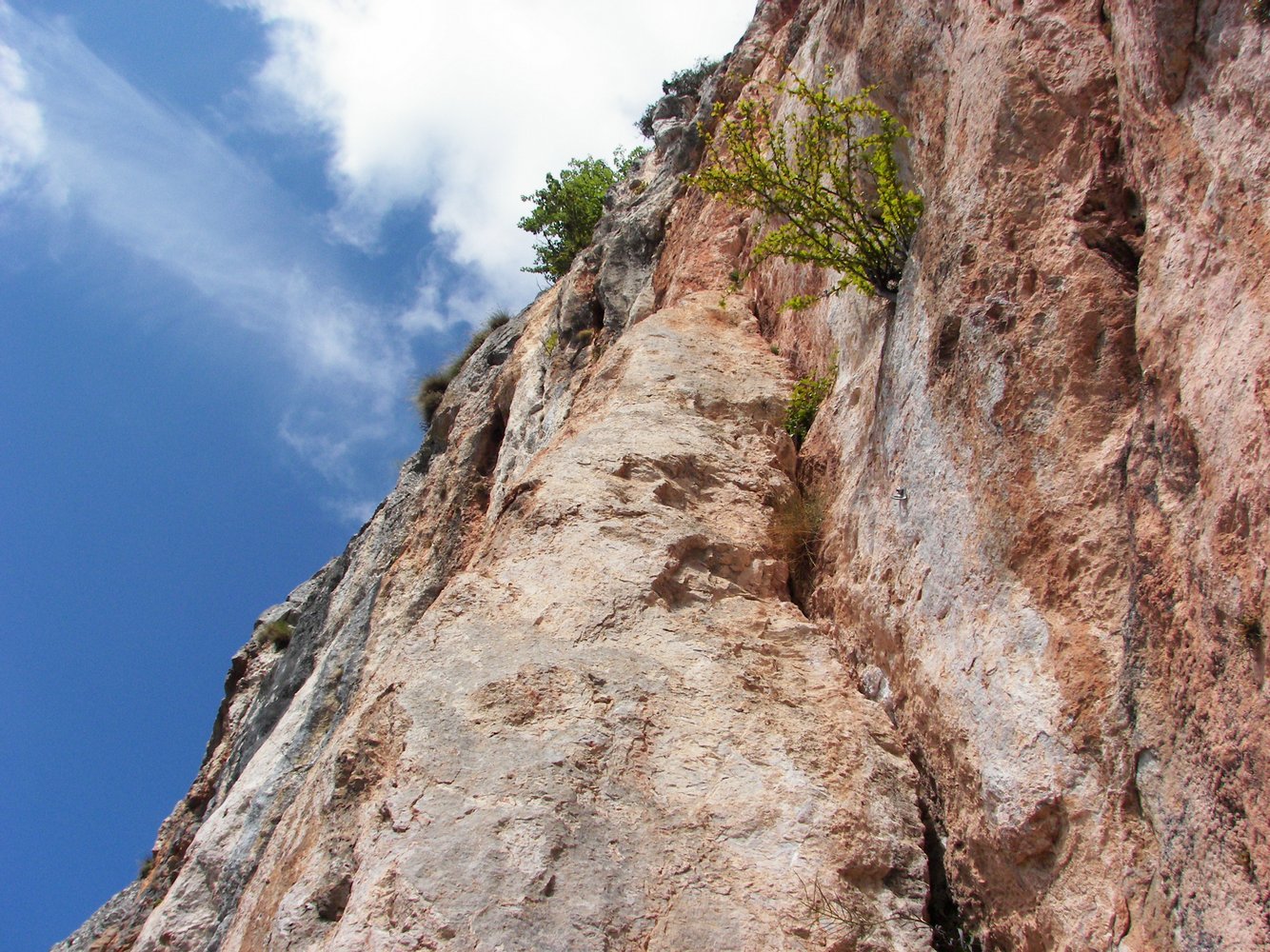Am Standplatz nach der 6. SL, Falkenbrut am 1.7.07. Merkmal: Die Alten schimpfen schon im Vorfeld (ab der 5. SL). Stinkt wie am Fischmarkt in unmittelbarer Nähe. Wird von toten Mäusen flankiert., Foto: Claudia Schott