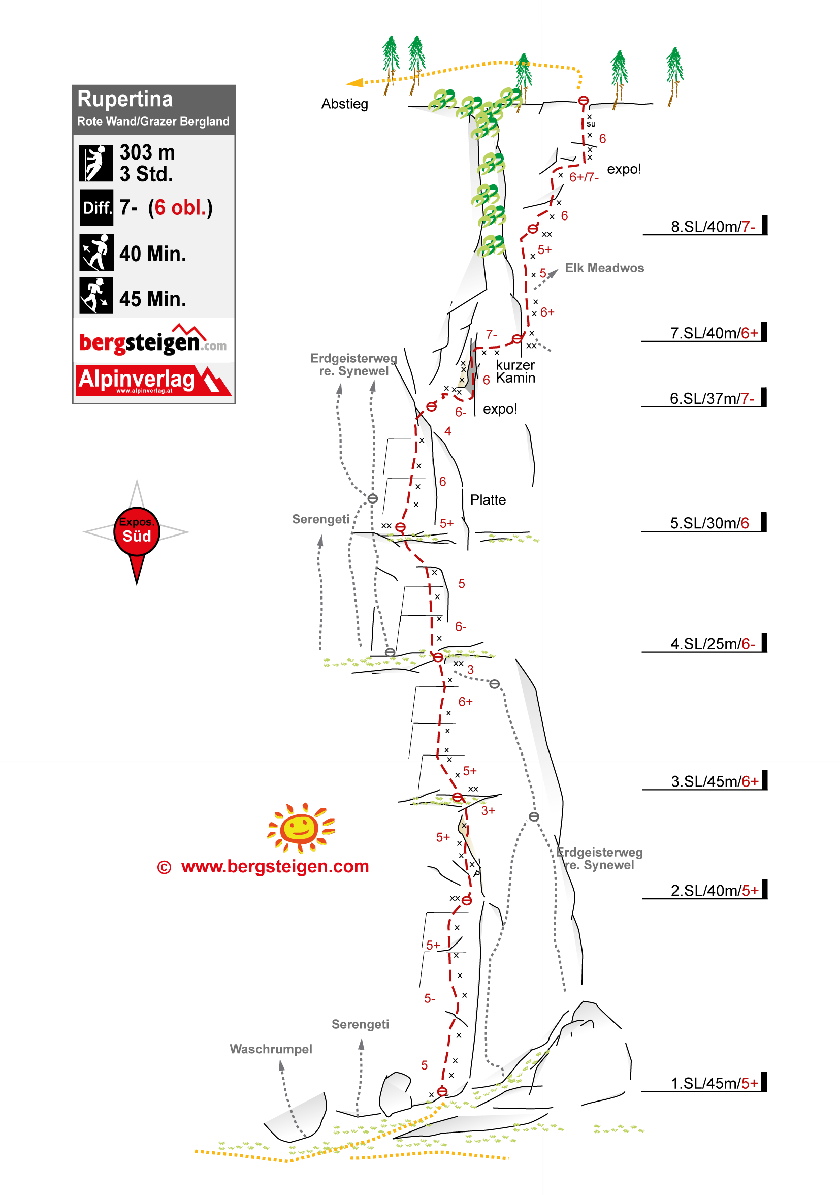 Schöne, abwechslungsreiche Route an der Roten Wand, die sich zum Klassiker entwickelt hat. Die Route wird nach oben hin steiler und auch schwieriger.