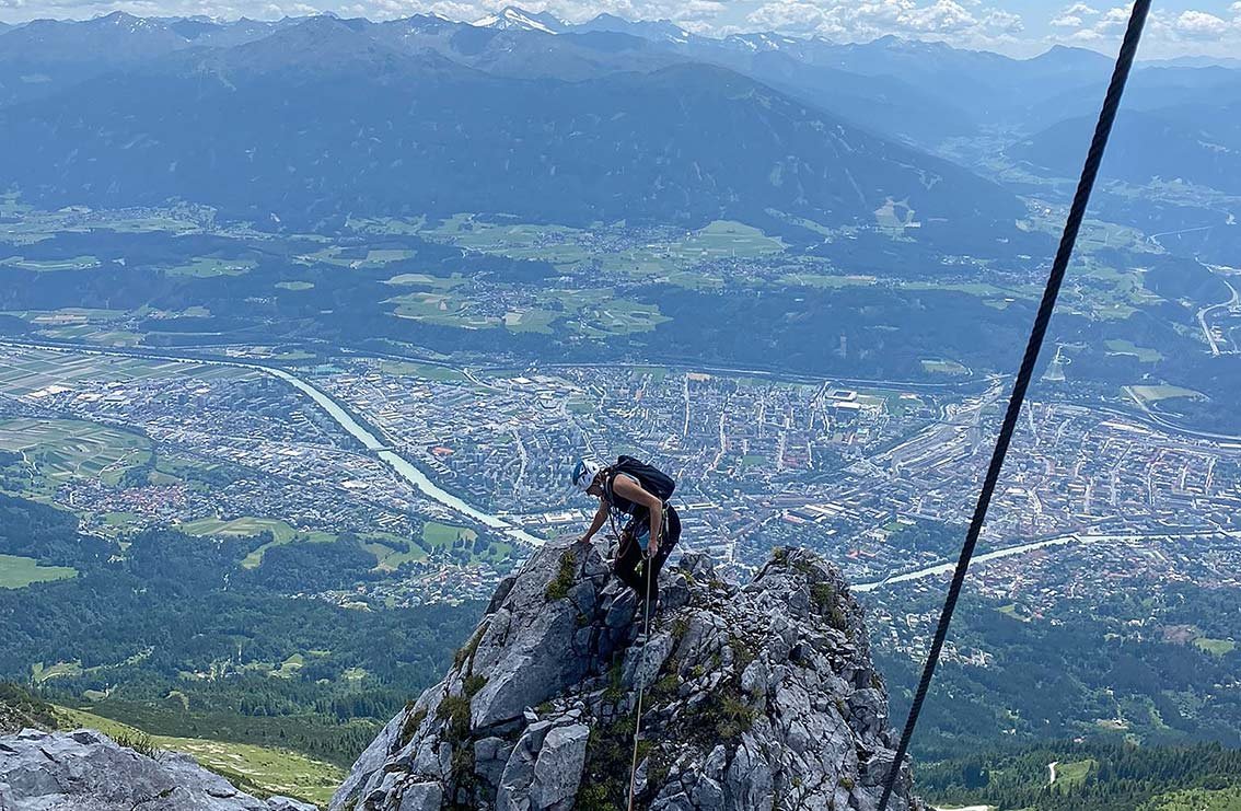 Nach der letzten Seillänge auf die Seegrubenspitze und von dort auf dem Klettersteig hinunter. Dann auf dem Wanderweg zum Hafelekar. Von dort entweder auf dem Wanderweg oder mit der Seilbahn ins Tal.