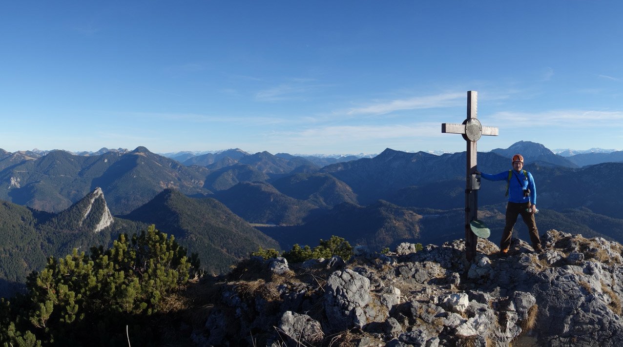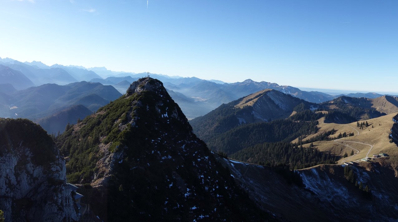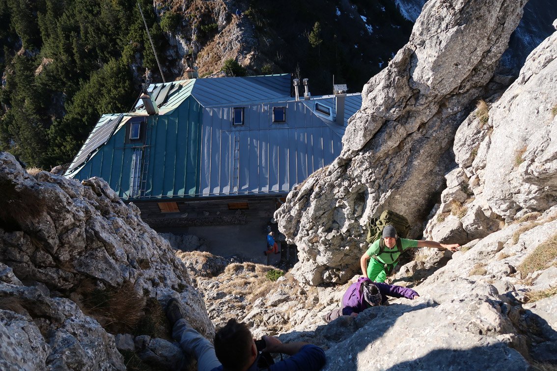 Zu Fuß auf dem Normalweg zur Tegernseer Hütte absteigen (Kletterpassagen bis 2). Von der Hütte über einen Mini-Klettersteig zurück zum Wandfuß. Abseilen über die Route nur im Notfall sinnvoll.