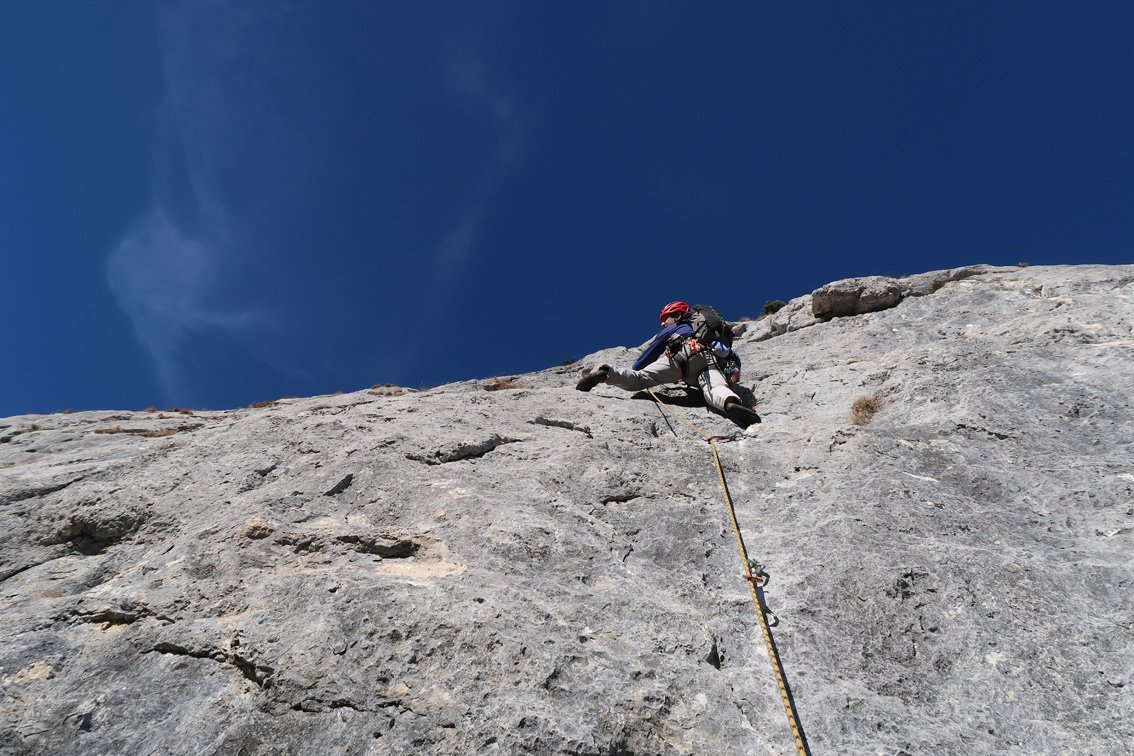 10 Expressschlingen, 60 Meter Einfach- oder Doppelseil, Bandschlinge und Helm. Für Ängstliche evtl. ein KK-Grundsortiment.