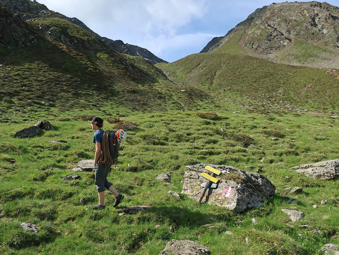 Von der Scharte entweder nach Süden oder nach Norden absteigen und den schwach sichtbaren Markierungen und Wegspuren zum Zustiegsweg folgen. Genau auf die Markierungen achten!