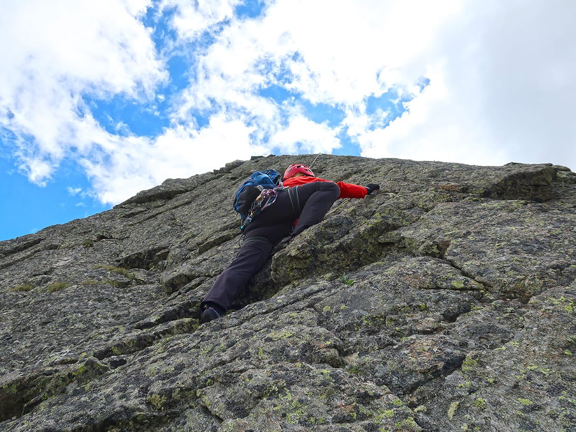 Nette Kurzroute in schöner, einsamer Umgebung. Geneigte Plattenkletterei in großteils gutem Granit, wie man ihn sonst in diesem Schwierigkeitsbereich nur selten findet. Die ersten drei Seillängen sind durchgehend im oberen dritten Schwierigkeitsgrad und sehr schön. Man würde sich mehr davon wünschen. Die letzten zwei Seillängen sind grasig, mit teilweise lockeren Blöcken – hier muss man vorsichtig sein. Wie im Granit üblich, ist der Fels mit Flechten bewachsen und die Tour bei Nässe unbedingt zu meiden! Der Gipfel der Sauspitze trägt ein Gipfelkreuz.