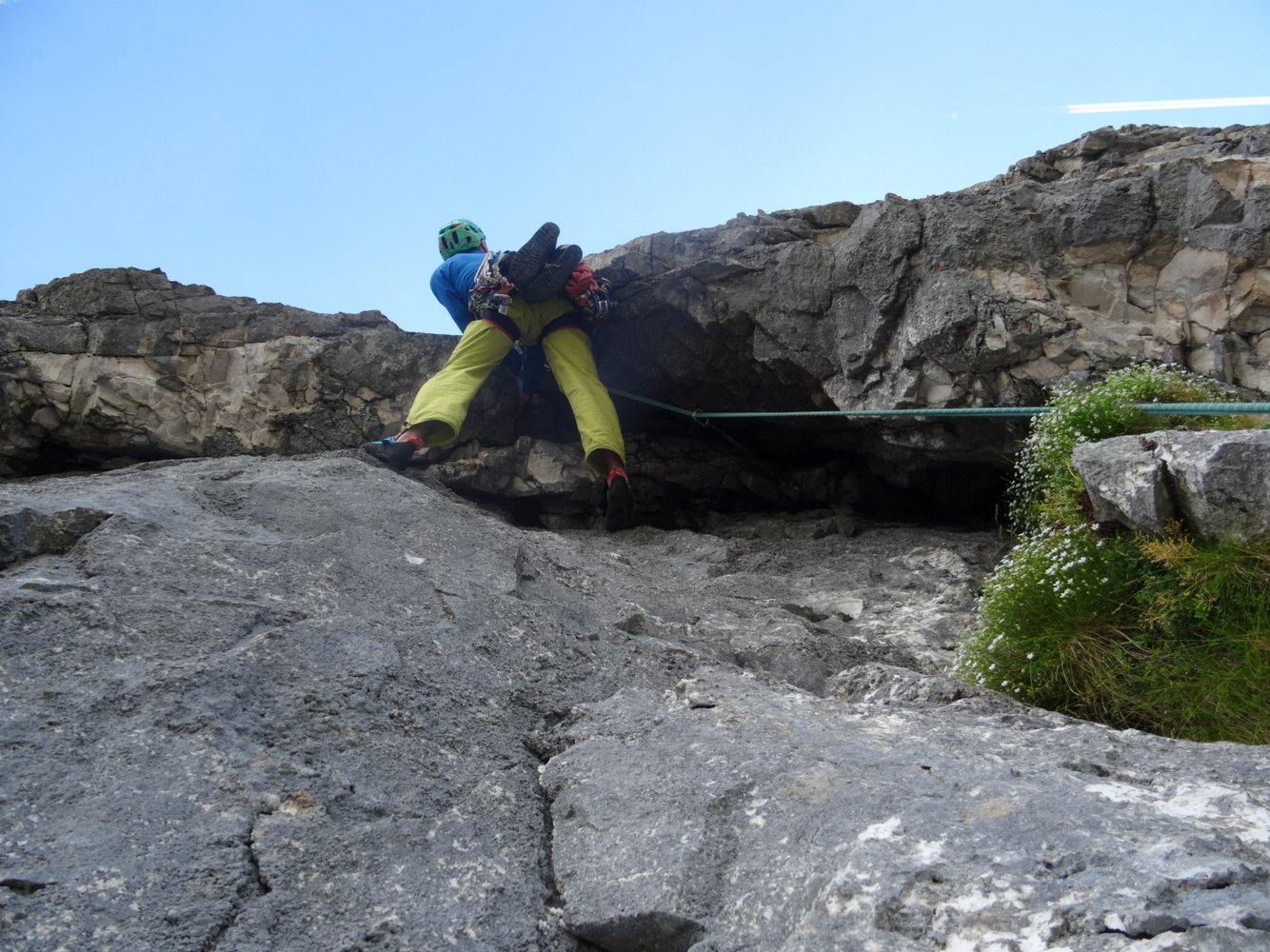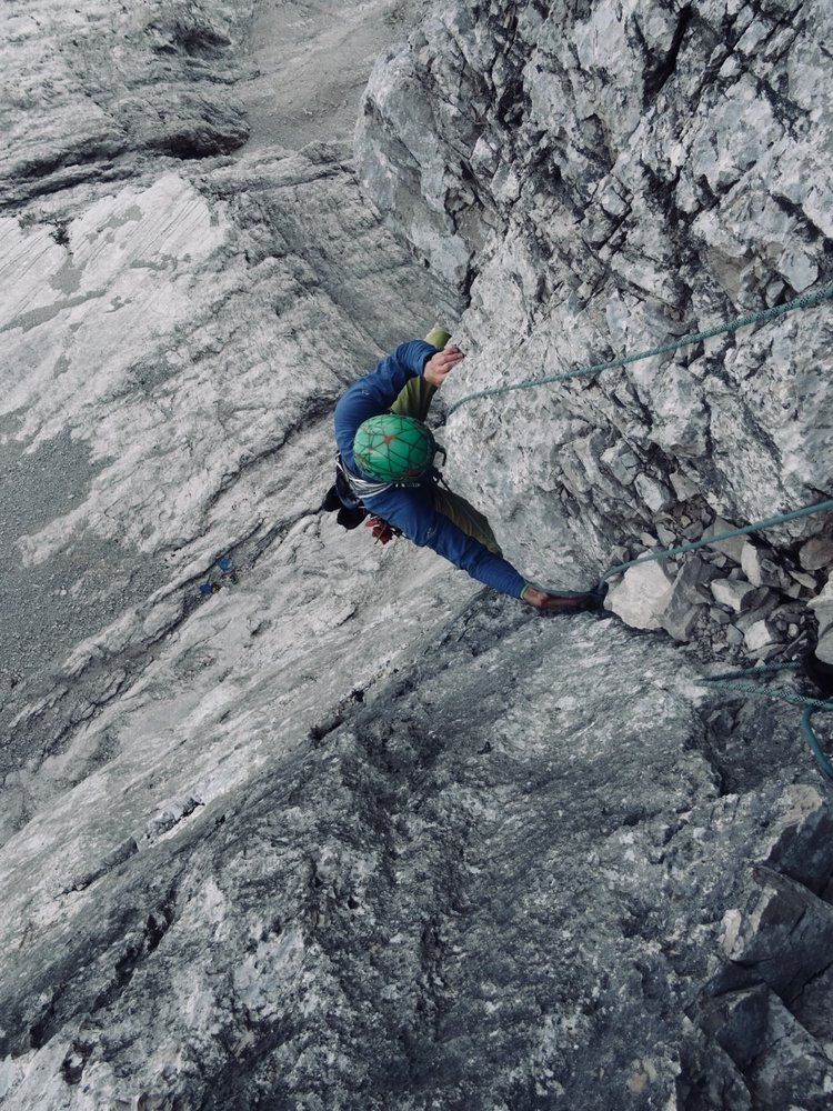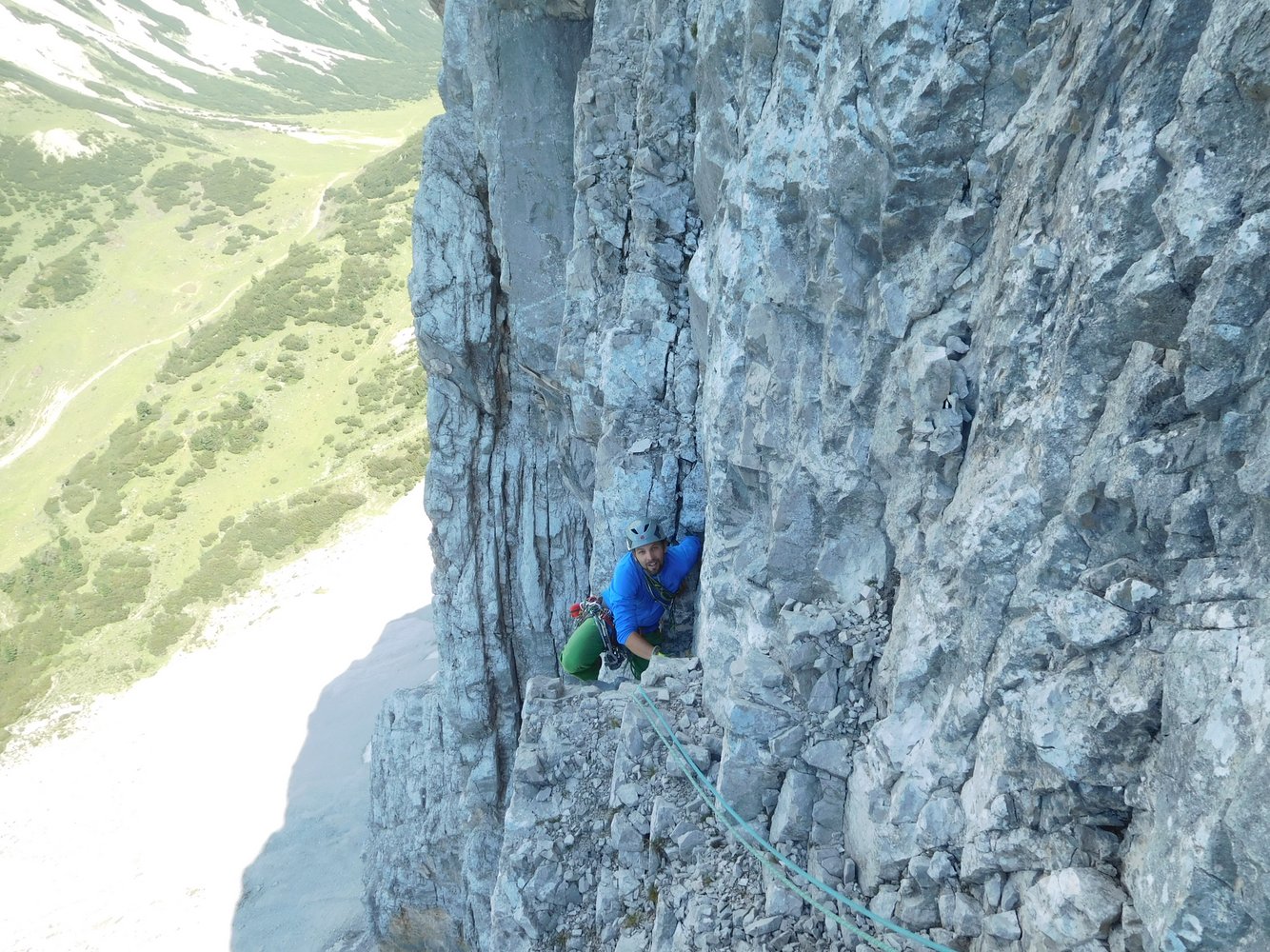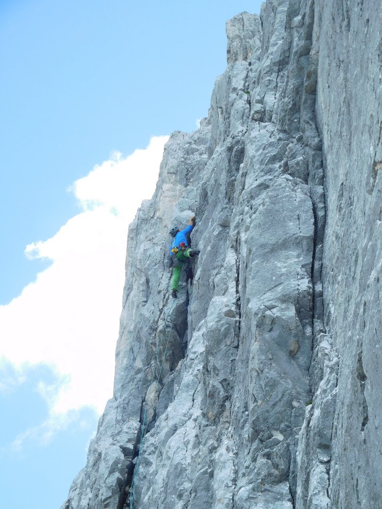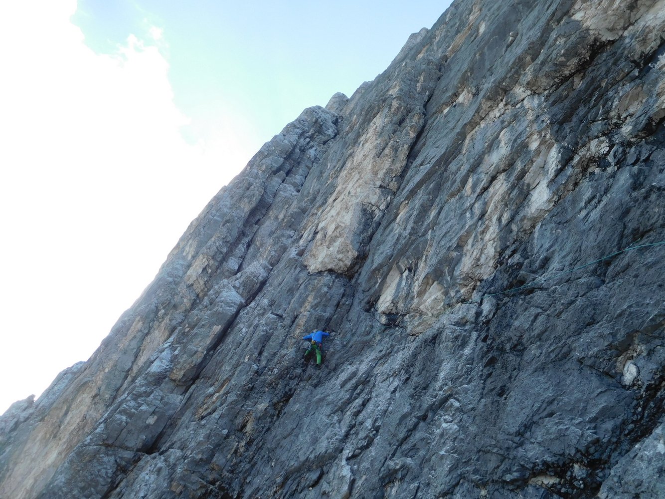 4. SL 30m VI-: Zuerst gerade empor, dann langer Quergang nach links zu H, dann gerade empor zu Stand, zum Beginn des Risses.