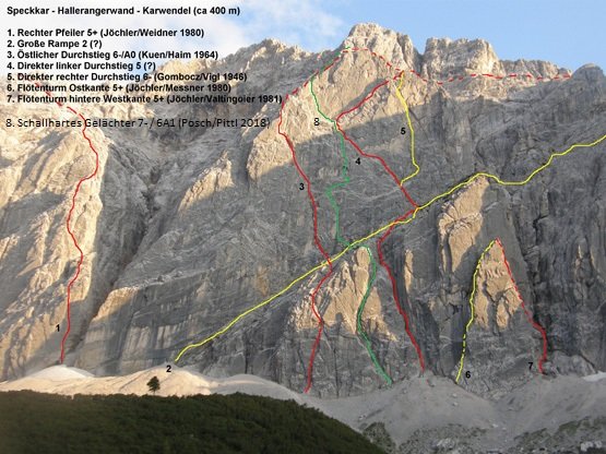 Von dort seilfrei hinauf zum Pfeilerkopf (III). Von dort quert man über Bänder westlich hinaus zum Steig, der auf die Speckkarspitze führt und über diesen zurück zum Haller Anger.