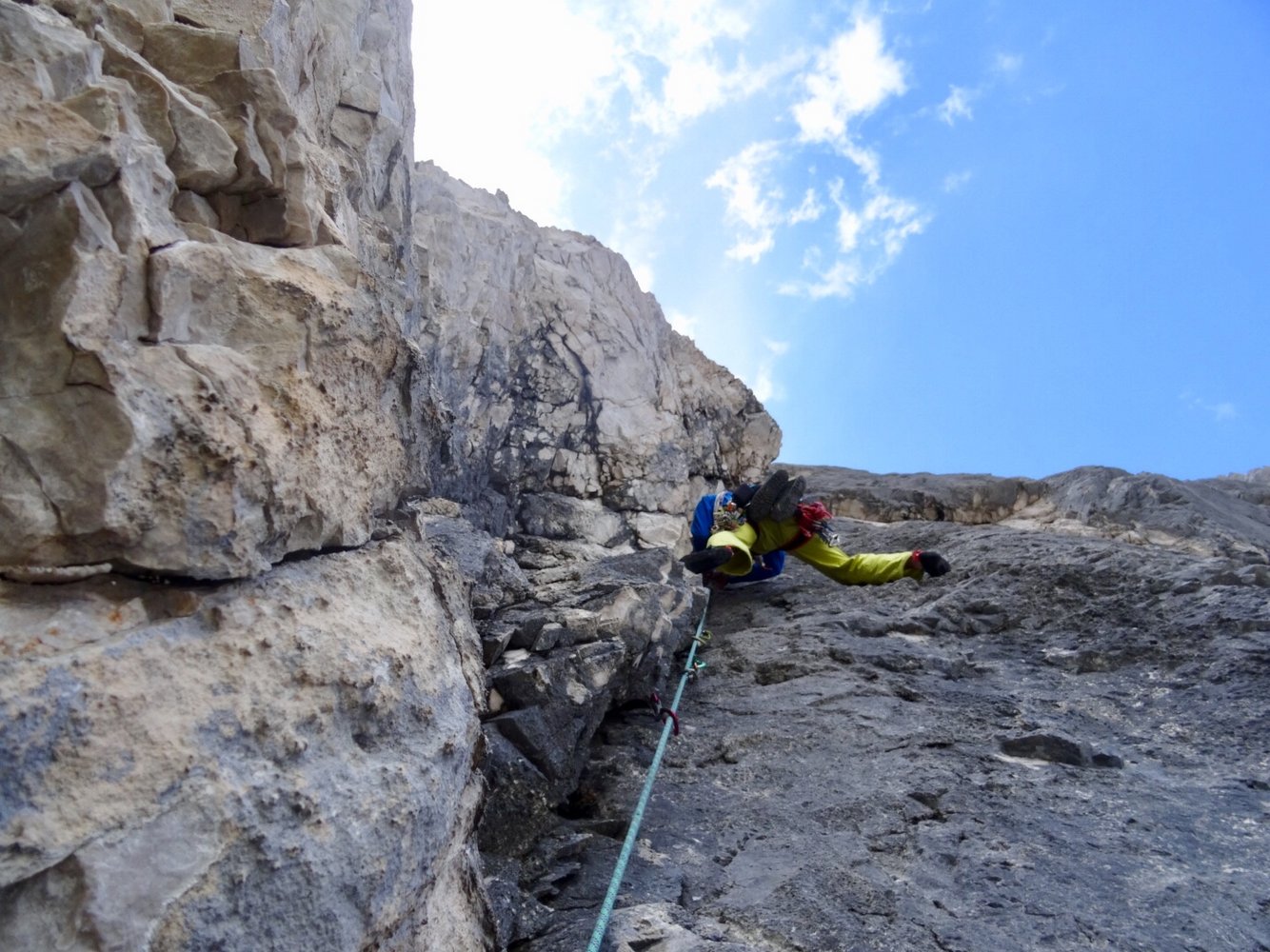 Seilfrei über das große Band, 20 Meter oberhalb der „Kuen-Haim Führe“ befindet sich der Einstieg in den oberen Wandteil.