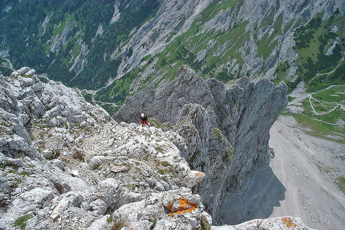 Diese großartige und lange Routenkombination - die nach dem Südgrat auch abgebrochen werden kann - zählt zu den am häufigsten begangenen Gratanstiegen bei der Fölzalm. Der Fels ist im unteren Teil der Routen teilweise brüchig, wird im oberen Teil aber besser. Man kann, ohne den Südgrat klettern zu müssen, durch die Nordschlucht zum Westgrat zusteigen. Die Kombination aus Südgrat und direktem Westgrat ist mit ca. 700 Klettermetern sehr lang. Der Mix aus schroffen Felswänden und den saftigen Almwiesen der Fölzalm ist landschaftlich sehr eindrucksvoll! Ein Abstecher zur Fölzalm lohnt sich auf jeden Fall. Mit etwas Glück kann man die Kletterer in den schweren Nordwandrouten beobachten.