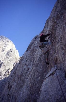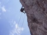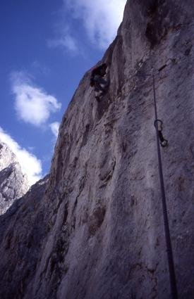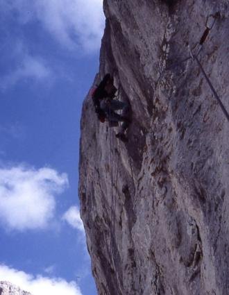 Insgesamt hängt die ganze Route / Wand vom ersten Meter bis zum letzten Meter auf einem schmalen Gratturm leicht über ! Die 3. u. 4. sl. sind am bösartigsten !