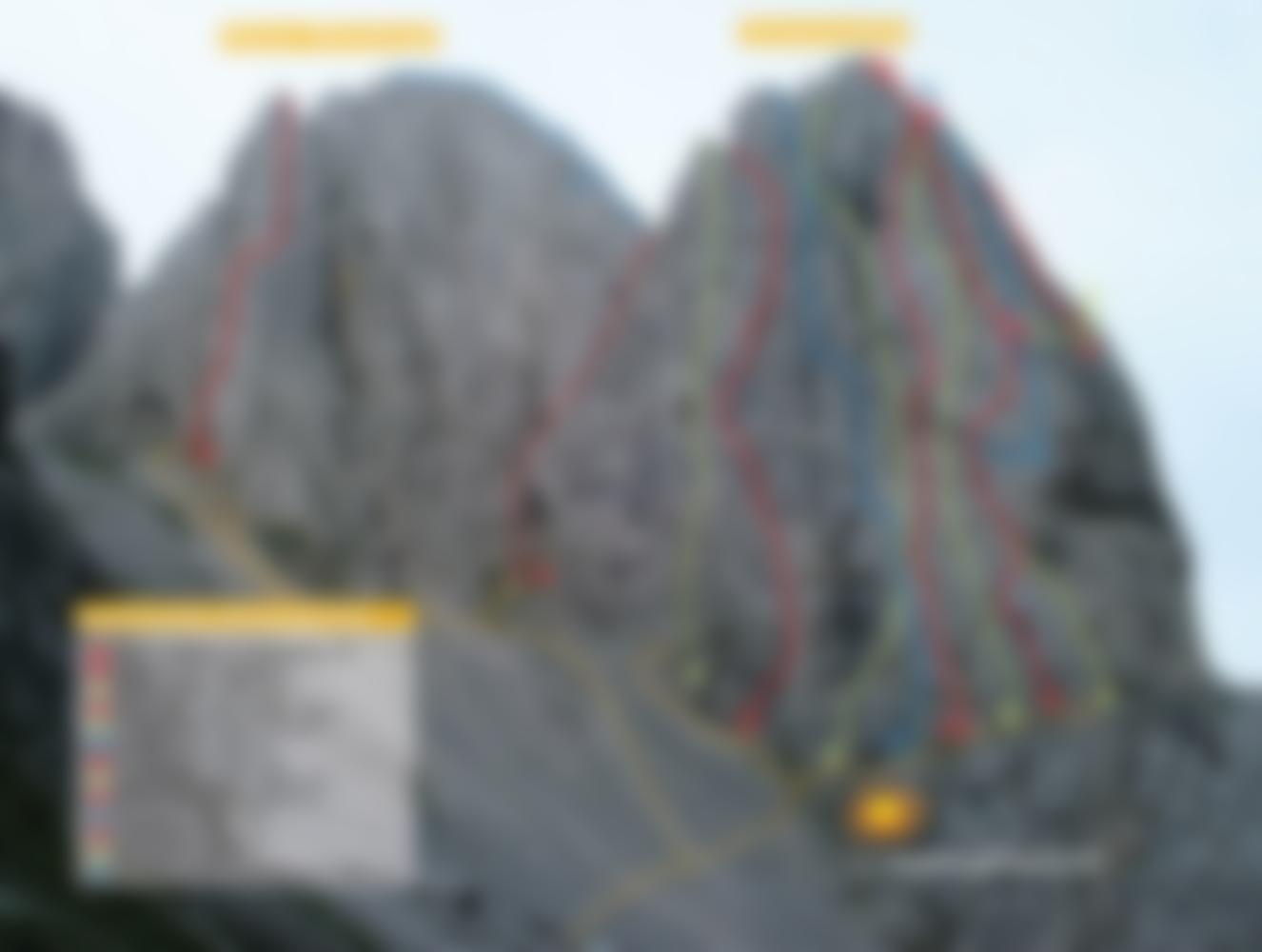 Eindrucksvolle Abseilmöglichkeit vom Ausstieg der Route (20/50/50/45) 2 externe Stände, leichtes pendeln in der 2. u. 3. Abseilstrecke vorteilhaft., 55 m Doppelseil günstig mit 50 ziemlich knapp.