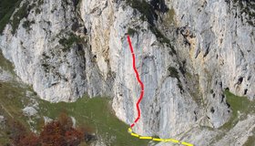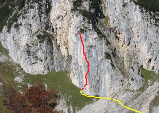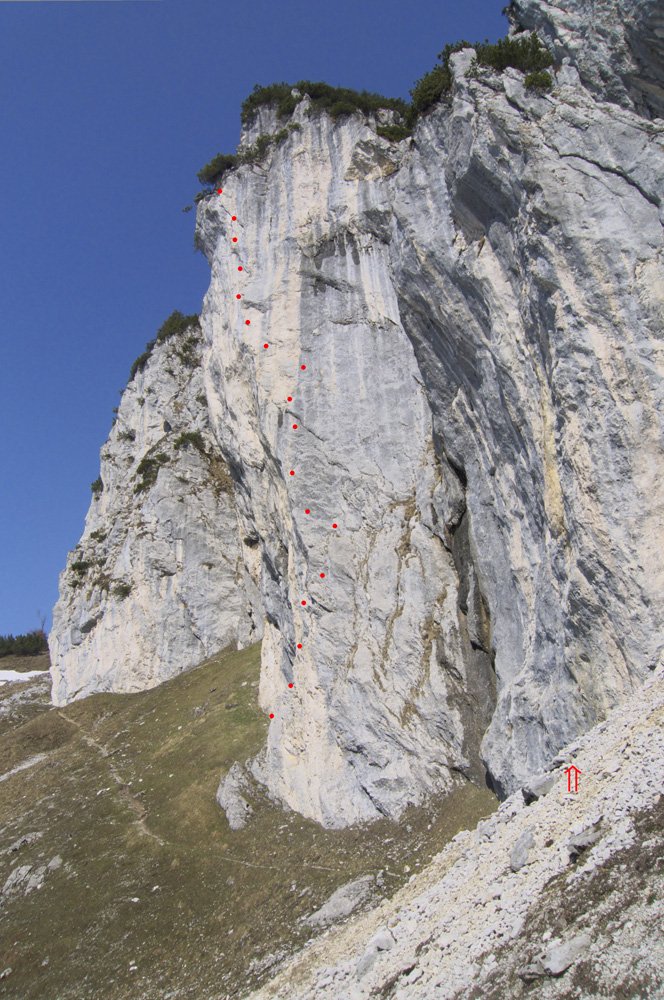 Unmittelbar gegenüber der beliebten Multerkarwand im Westkaiser oberhalb der Wegscheidalm befindet unterhalb des Schneekars ein steiler Felsriegel mit Wasserfall. Rechts und vor allem links des Wasserfalls gibt es einige kurze Sportkletterrouten und an einem der höheren Pfeiler weiter links verläuft eine brandneue Sportkletterroute von Klaus Zehetner und Arne Eckenberger. Steile Sportkletterroute an einem sonnigen, luftigen Pfeiler. Nach Regen schnell trocken.