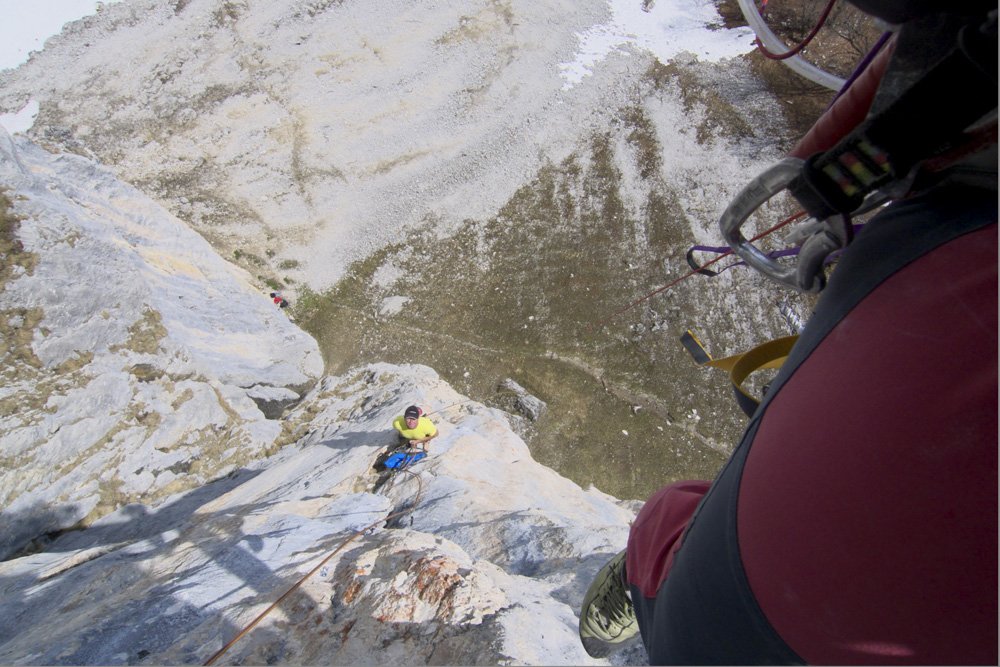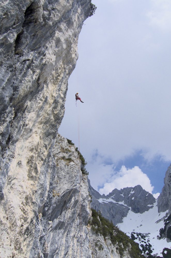 Abseilen über die Route (50 m Doppelseil), Bei der ersten Abseillänge Zwischensicherungen einhängen!.