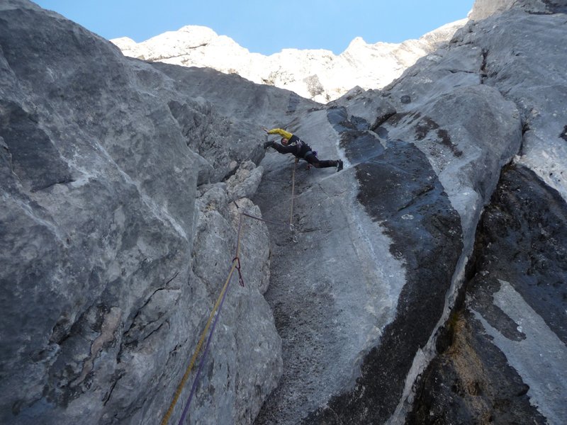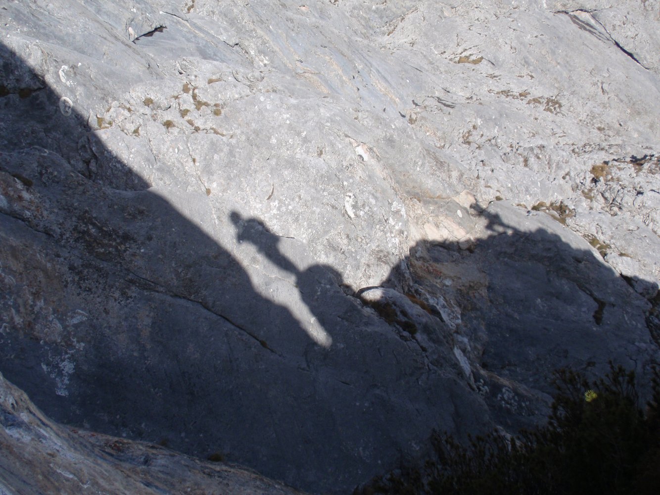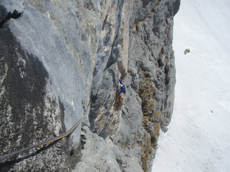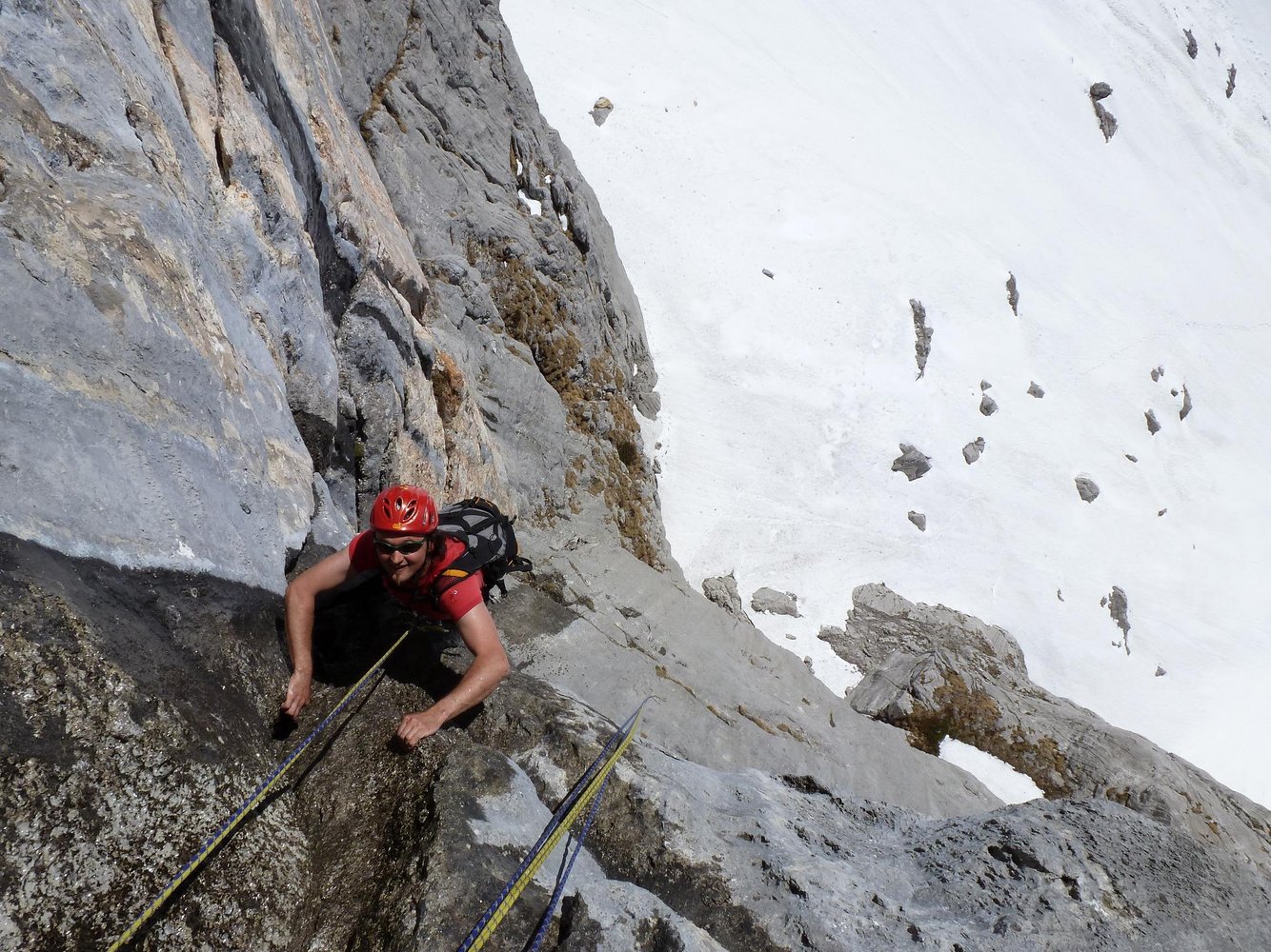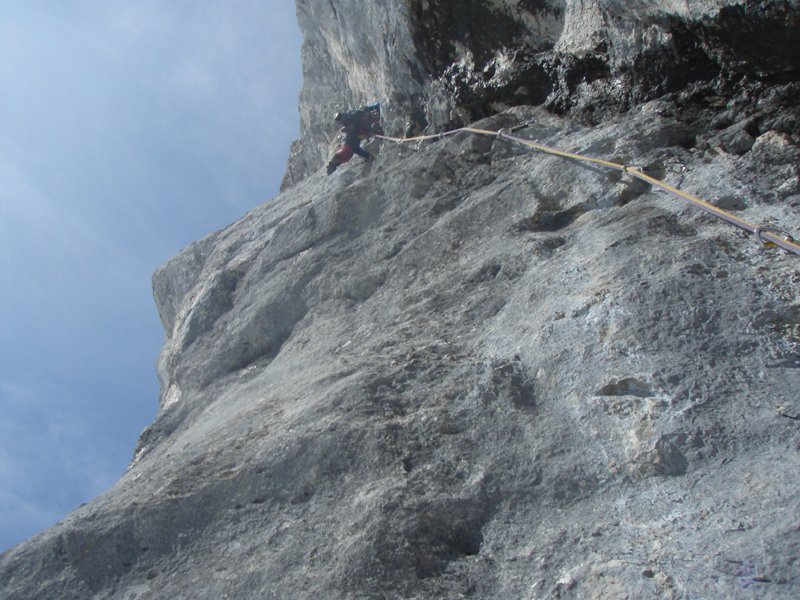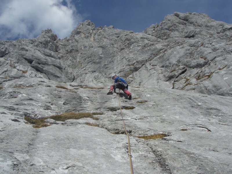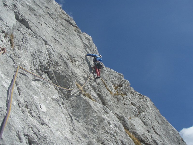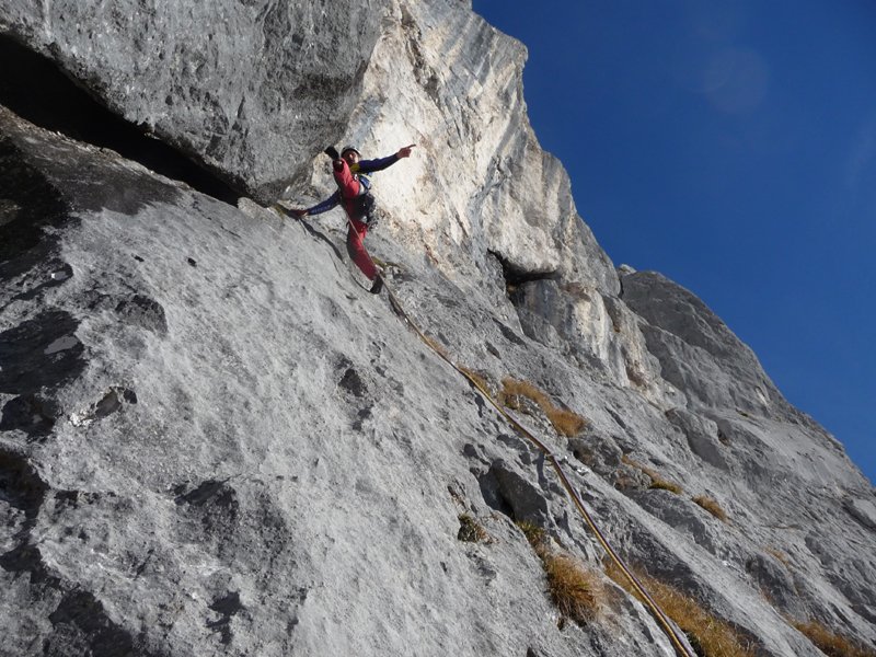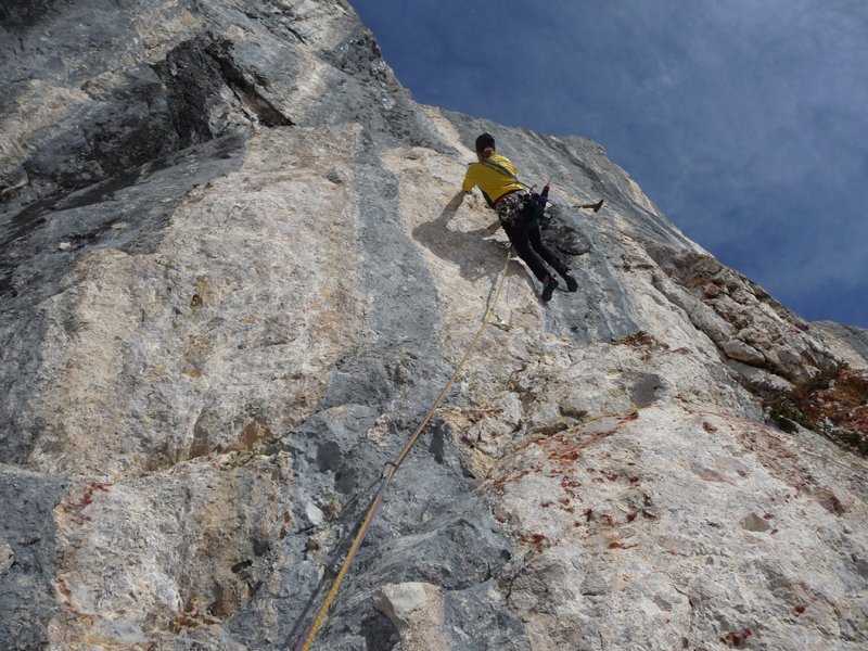 Die Schlüsselstellen im untersten Teil (3. und 4. SL) sind öfters und nach Regntagen auch länger nass. Allerdings ist der Fels dort sehr rau.