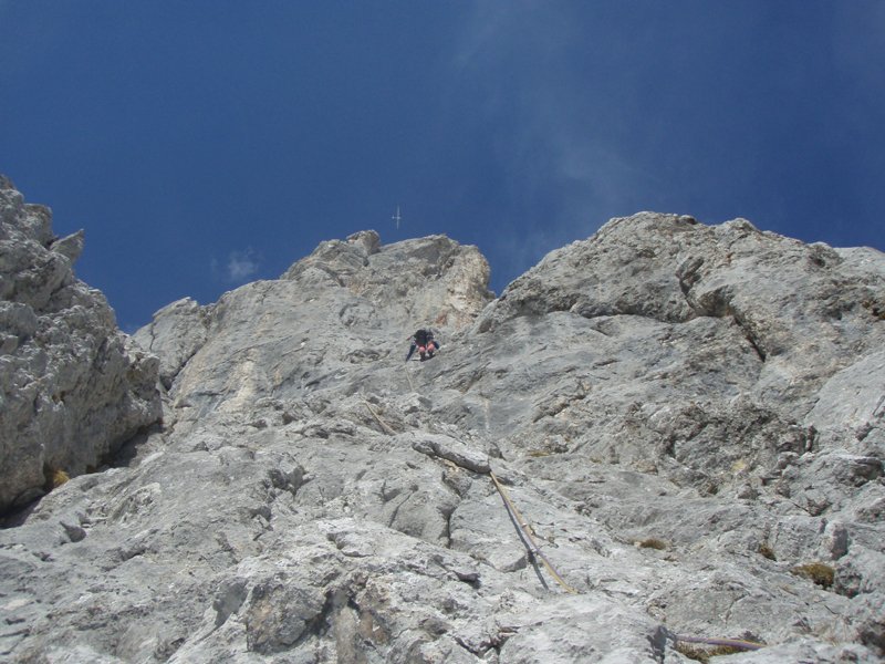 Achtung: Sollten sich bereits Kletterer im oberen Teil der Route befinden ist für nachkommende Seilschaften mit Steinschlag zu rechnen. Besonders der flache Mittelteil ist diesem stark ausgesetzt. Ein Rückzug aus der 3. und 4. Seillänge ist mit Schwierigkeiten (stark überhängend und schräg) verbunden!
