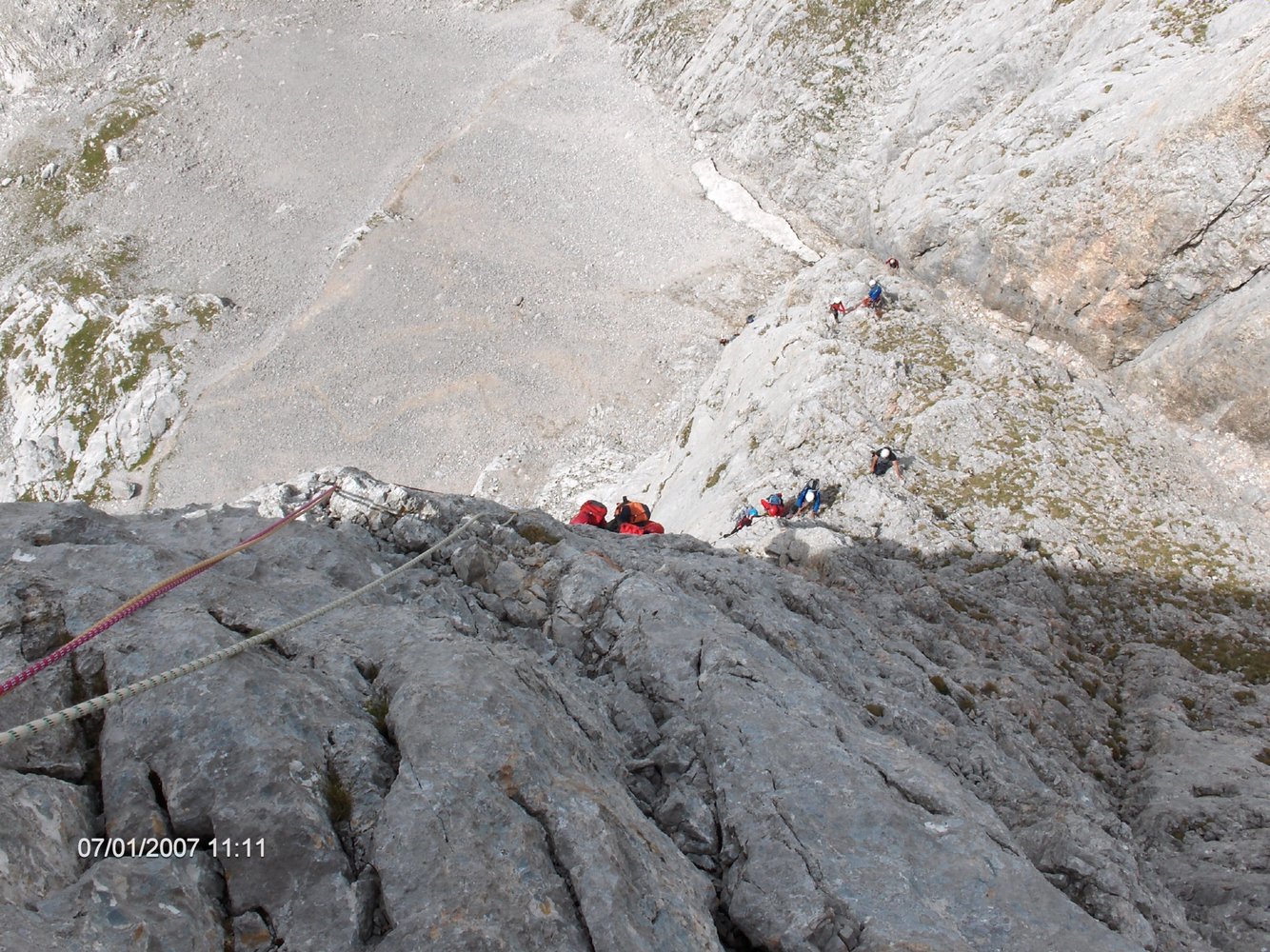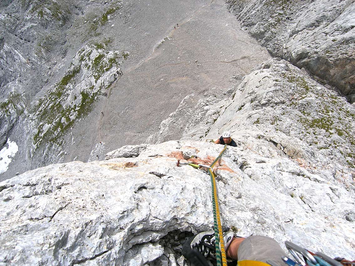 In den leichten Seillängen meist nur 1 bis 2 Haken, in den luftigen Kantenlängen 4 bis 5 Haken.