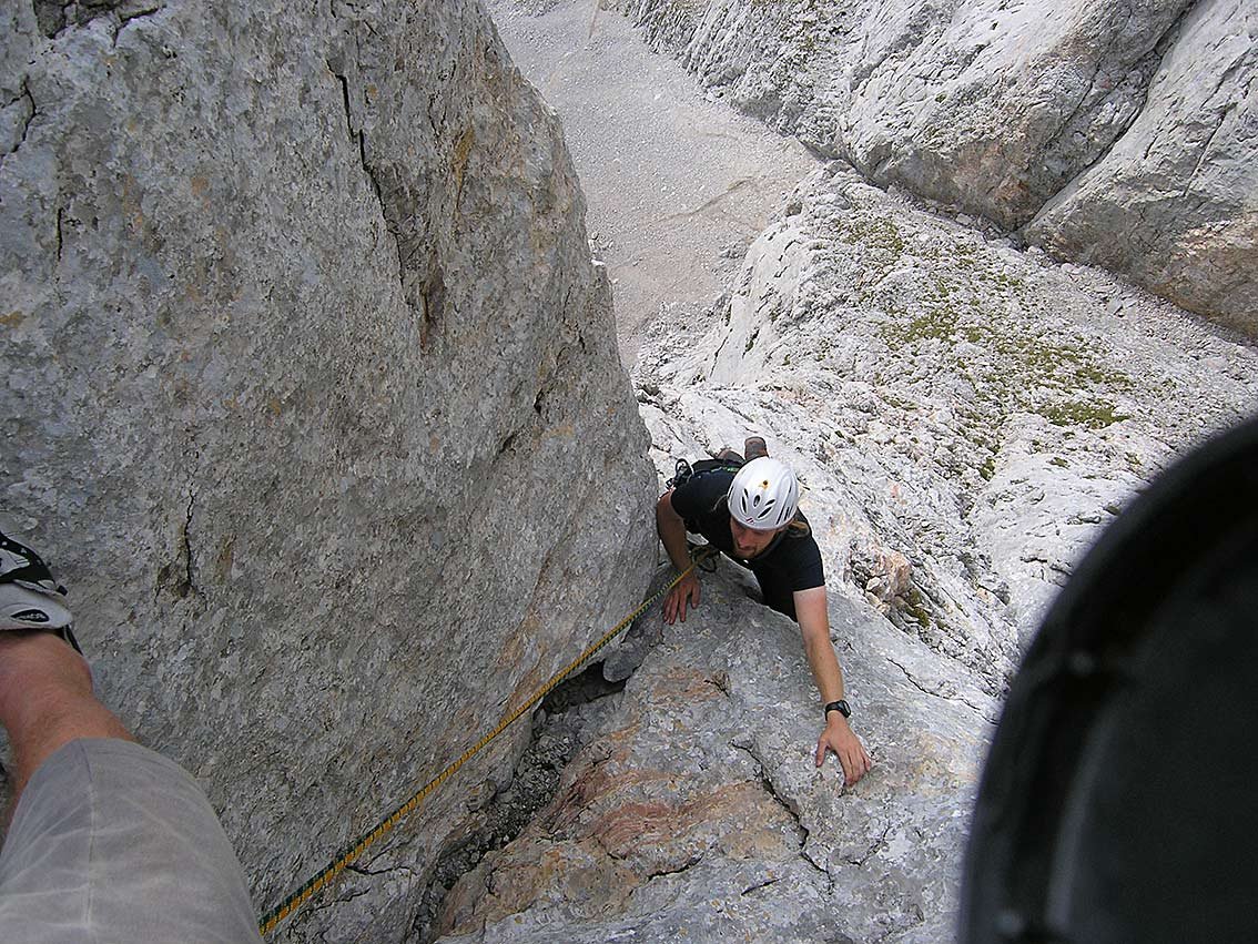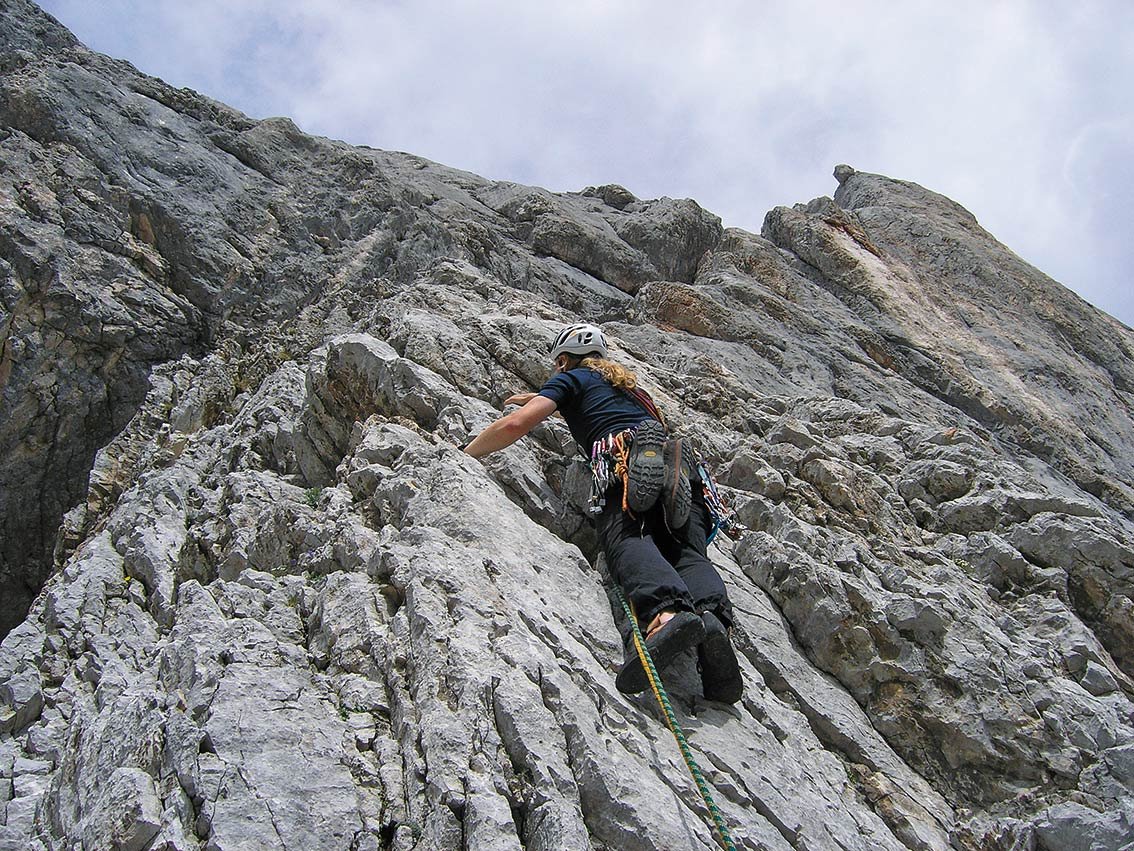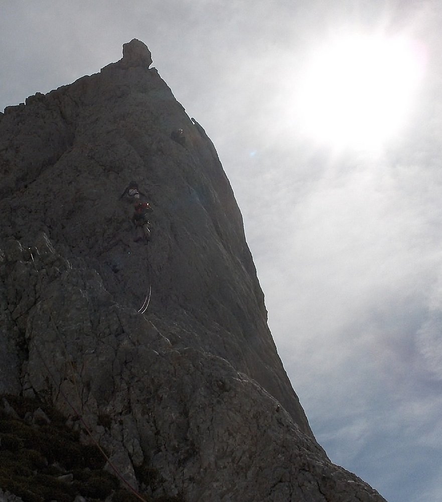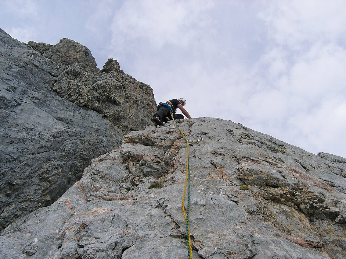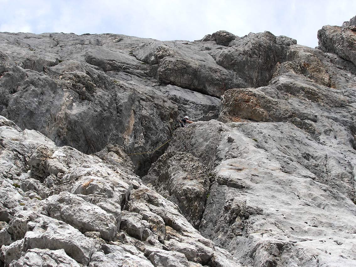 Die ersten vier Seillängen können nach längeren Regenfällen bzw. im Frühjahr noch nass sein. Es hält sich auch oft länger der Schnee in den schattigen Rinnen im unteren Teil der Tour. Absicherung besteht aus einzementierten Normalhaken und Bohrhaken am Stand.