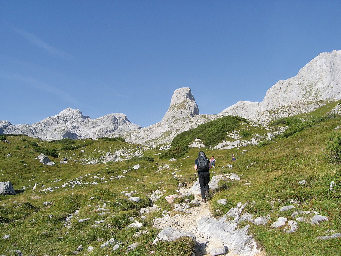 Vom Gipfel östlich über den Normalweg zum Einstieg hinunter (Steigspuren, Steinmänner). Es gibt beim Abstieg leichte Kletterstellen im Schrofengelände, diese sind bei Nässe heikel. Unten dann zum Zustiegsweg und auf diesem wie beim Aufstieg hinunter zur Mitterfeldalm und weiter zurück zum Arthurhaus (großer Parkplatz).