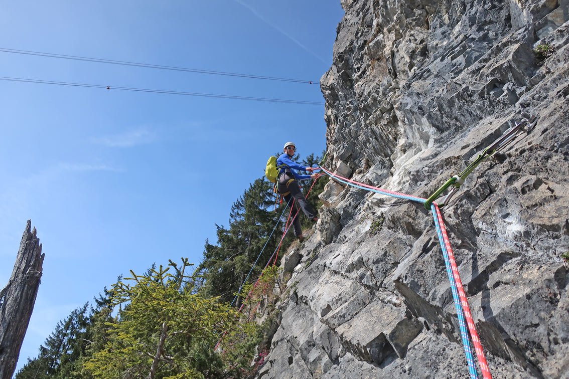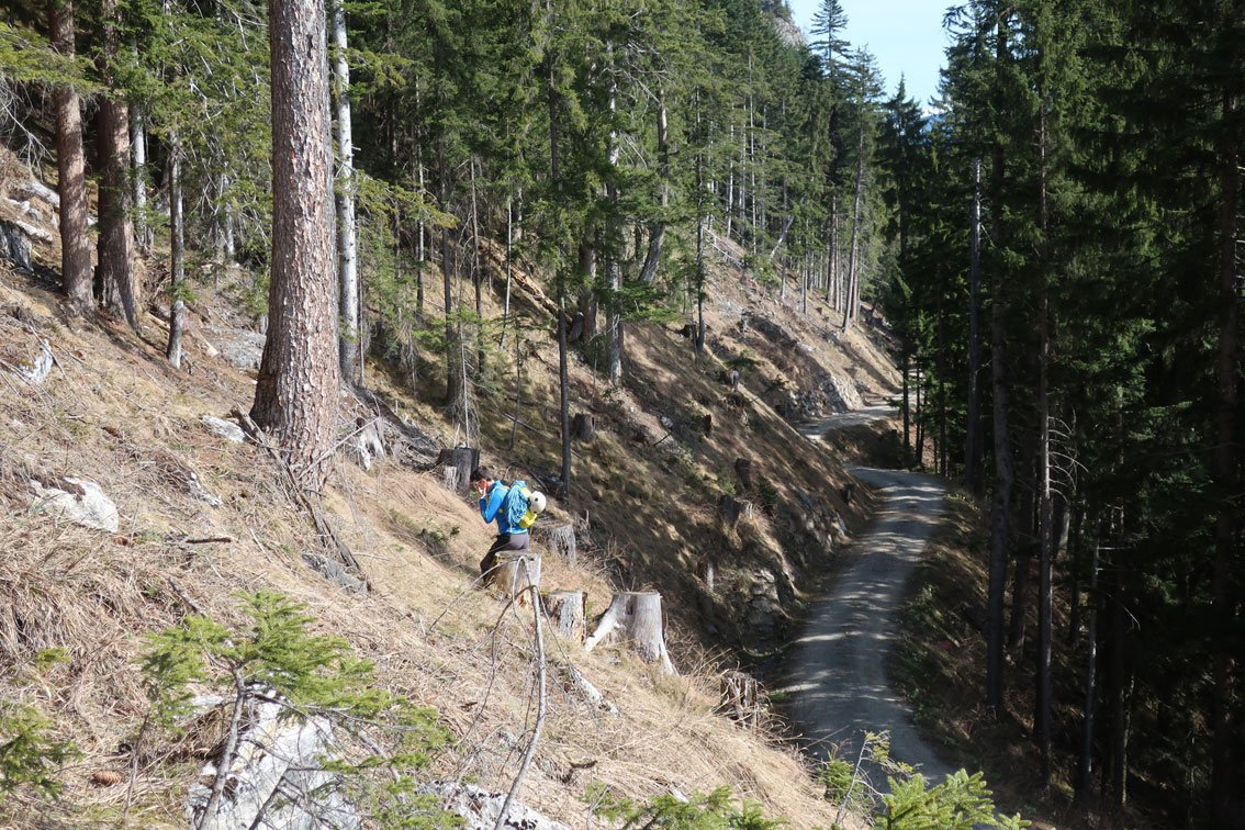 Vom Ausstieg entweder weiter hinauf zum Grubenweg und auf diesem zur Route "Altweibersommer" oder man steigt links im sehr steilen Wald wieder zurück zum Wandfuß ab.
