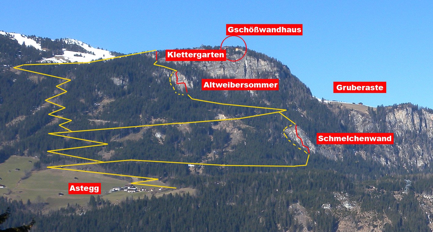 Gut mit dem "Altweibersommer" zu kombinieren - die Route ist einen Tick besser, aber auch brüchig. Oben steigt man dann über eine Route im Klettergarten zur Hochfläche neben dem Gschößwandhaus aus. Von dort auf dem Wanderweg zurück nach Astegg absteigen. Diese Kombination wird von den Einheimischen "Umweg zum Gschöß" genannt.