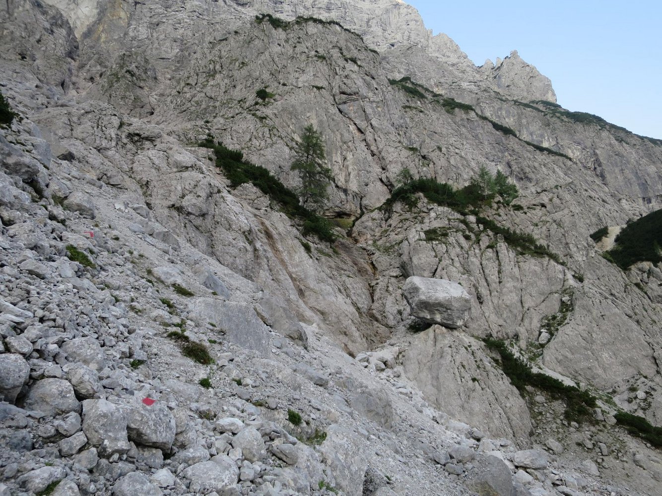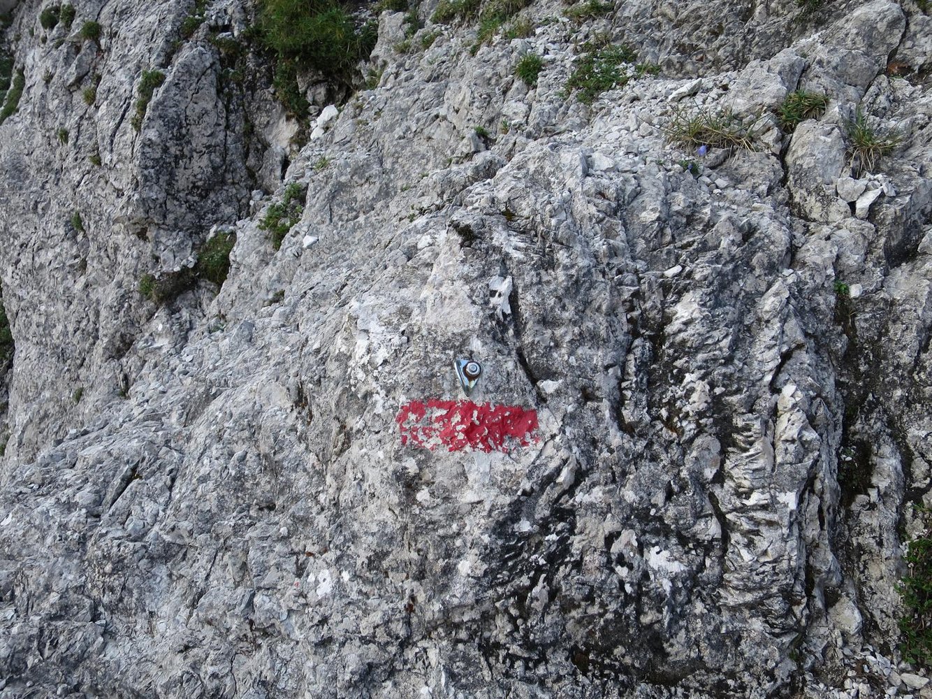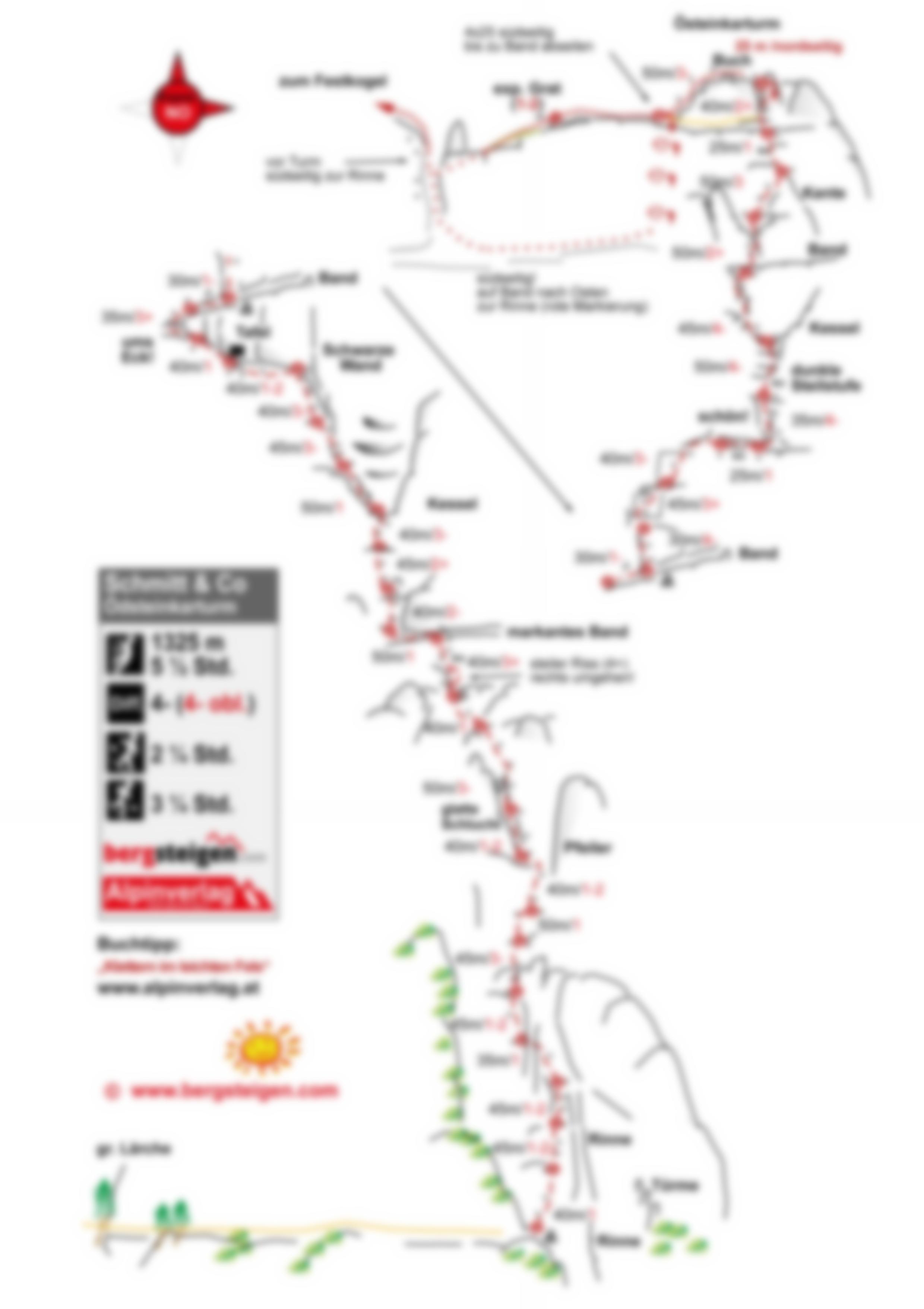 Die Route hat bei den Bohrhaken rote Markierungen, welche die Richtung angeben. Horizontal = Stand, sonst immer auf die Richtungsangabe achten und dieser folgen!