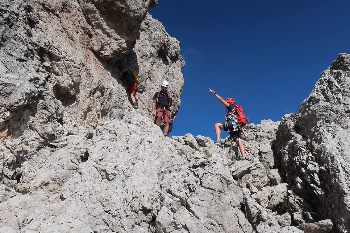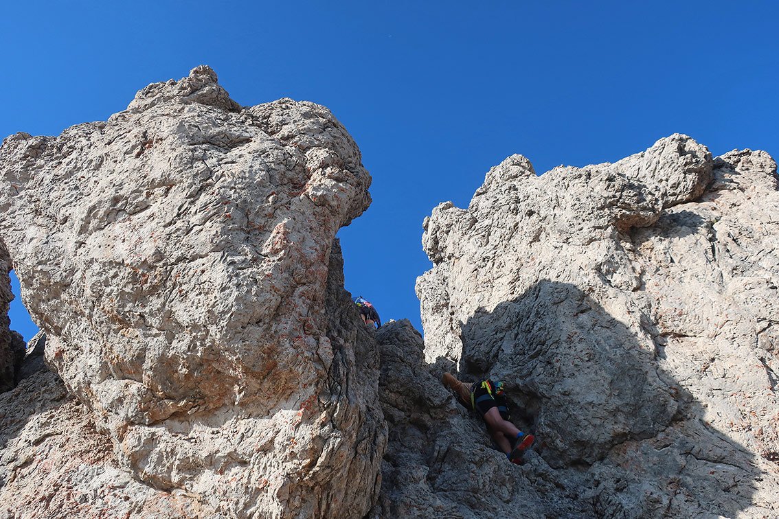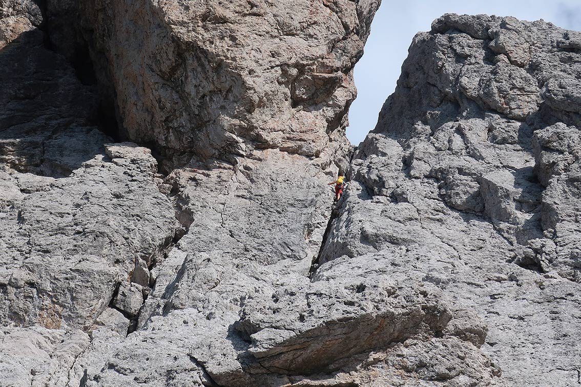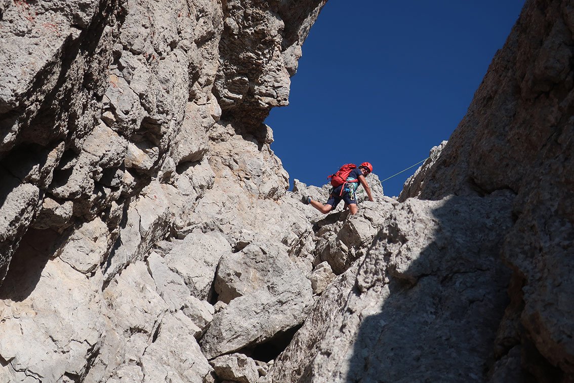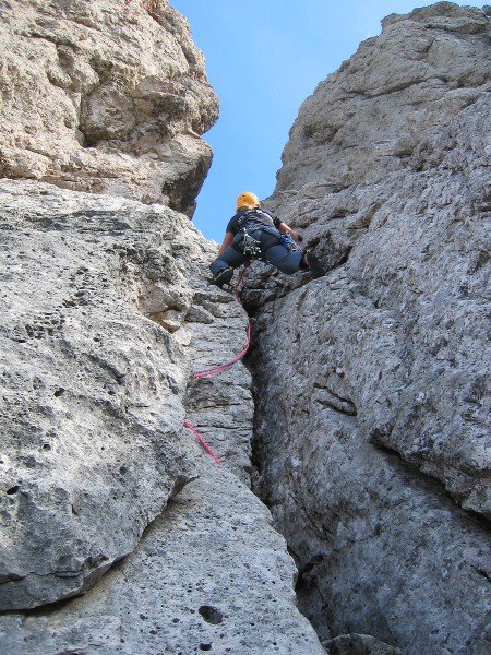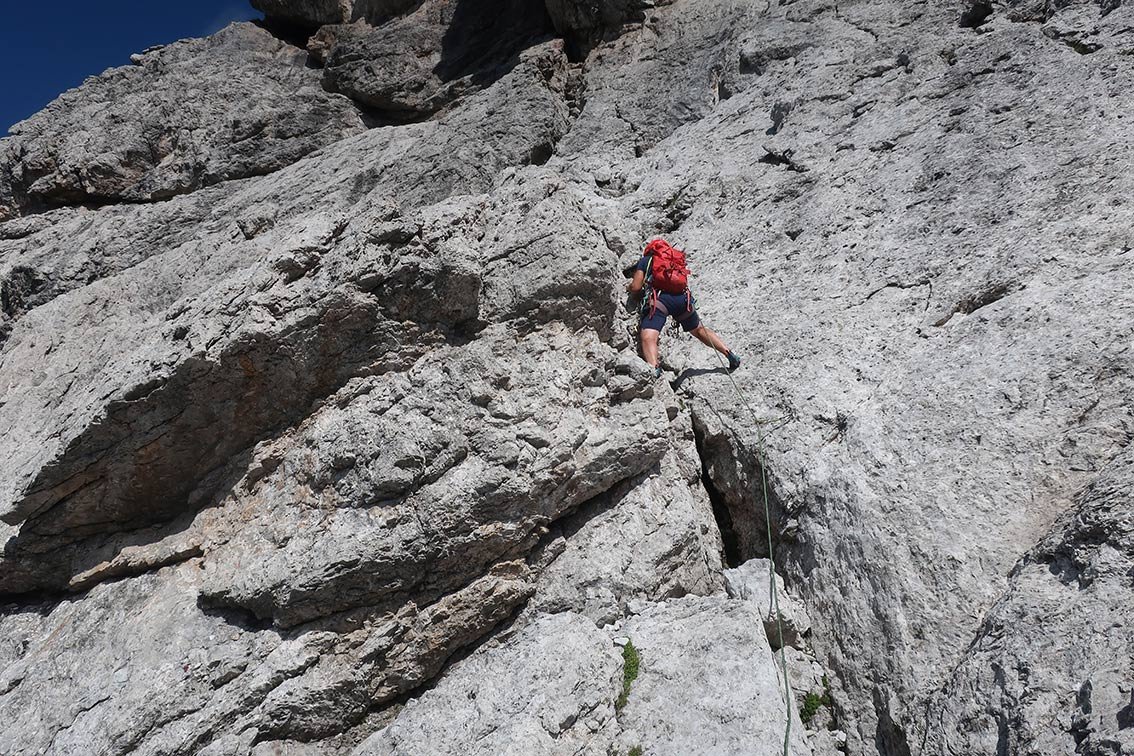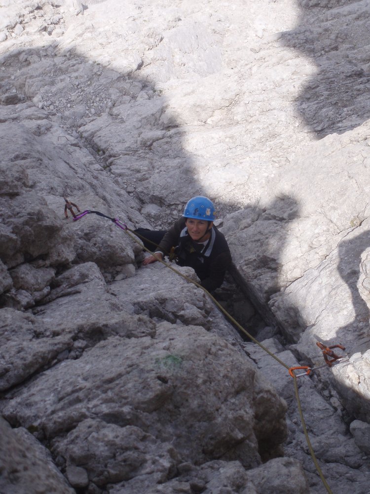 Bis in die breite, leichte Schlucht und den leichten Abschlusskamin (3. SL) gut mit Bohrhaken und Theniushaken abgesichert.