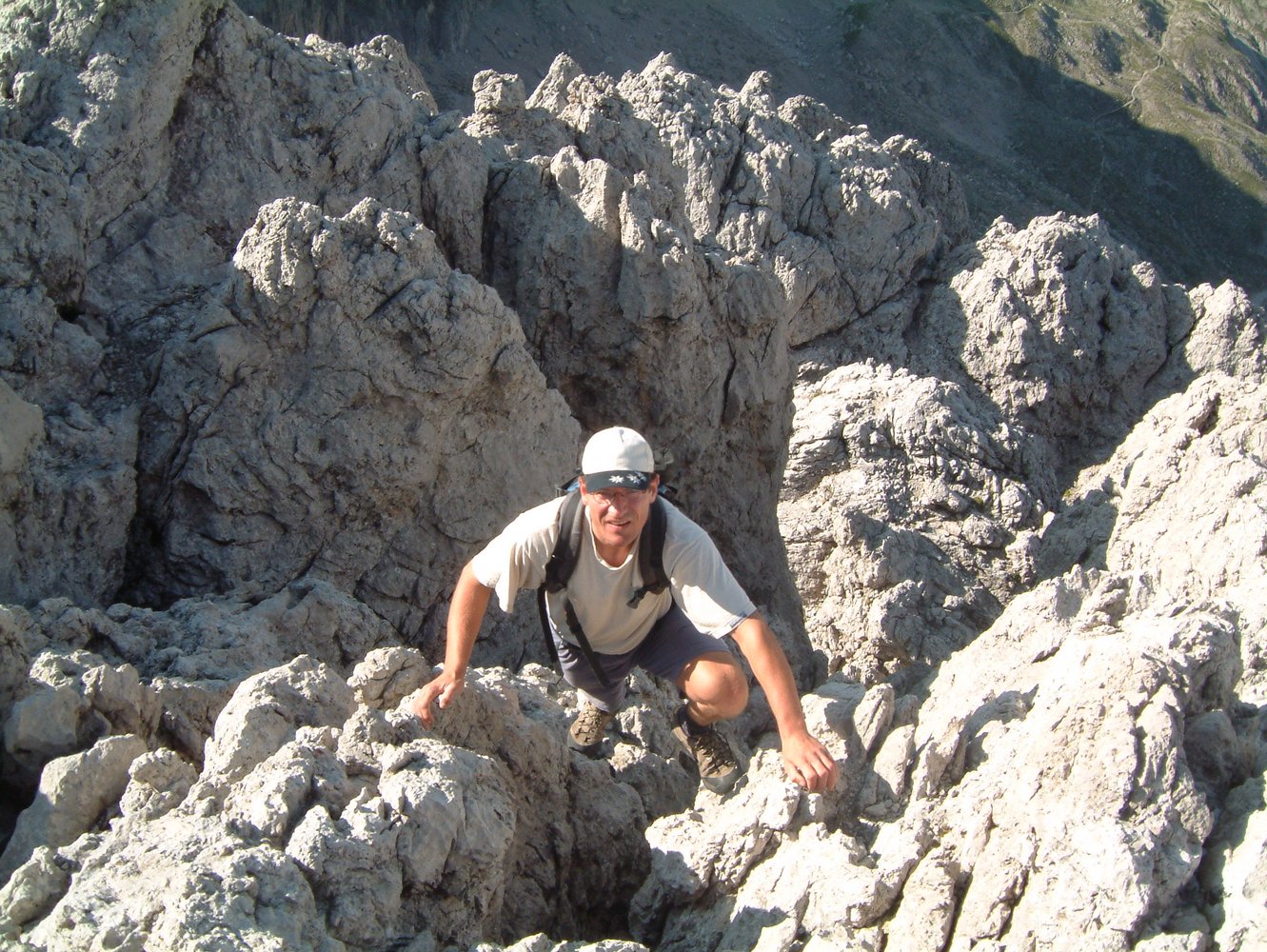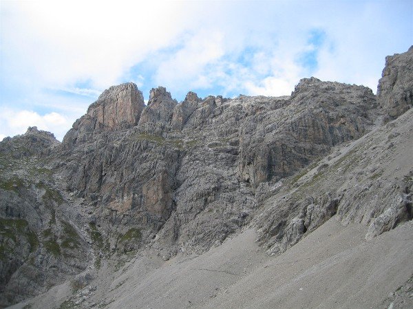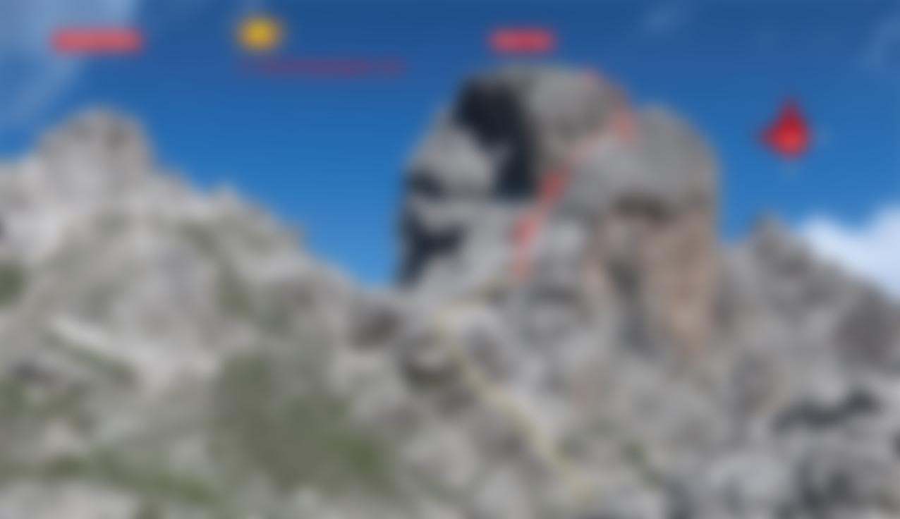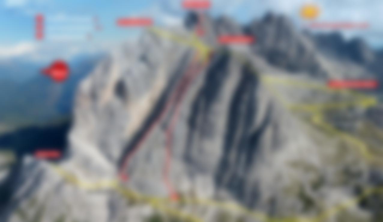 Anstatt über den Schmittkamin abzusteigen, kann man auch die Überschreitung zum Gr. Laserzkopf machen (siehe Übersichtsbild) Schwierigkeit eine stelle 3-, kaum Haken. Vom Gr. Laserzkopf über den blau markierten Steig zurück zum Roten Turm.