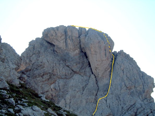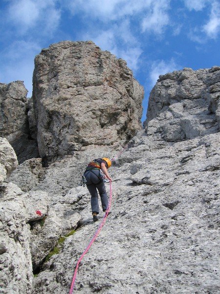 Von der Scharte (siehe Zustiegsbeschreibung) noch einge Meter über Gehgelände zun ersten BH. Weiter siehe Topo.