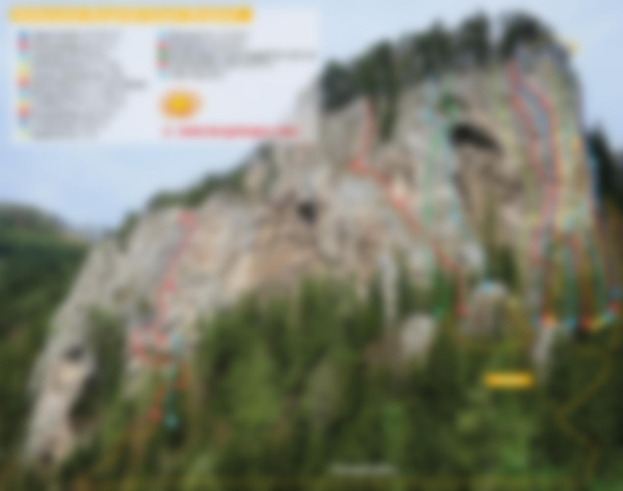 Links auf der Straße etwas bergab, nach ca. 100 m beginnt rechts ein kleiner Steig, der zu einem alleine stehenden, großen Felszacken hinaufführt. Von dort in wenigen Schritten unter die Wand. Der Einstieg ist bei einer Holztafel rechts der Ostkante.