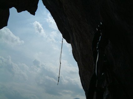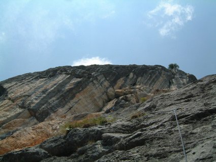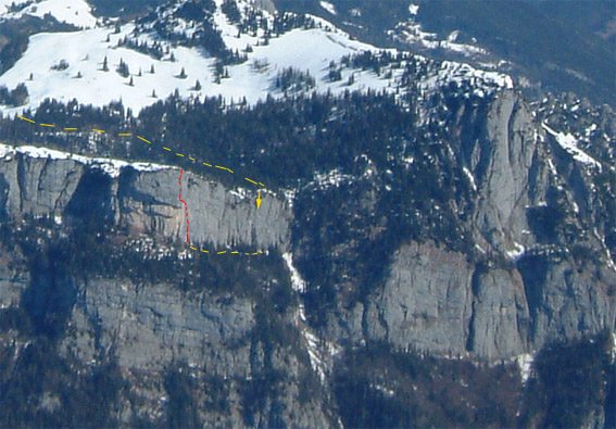 Am Wandfuß angelangt wandert man etwa 10 Minuten nach links (Blick auf die Wand) bis man unter der mark. Dachzone steht.
