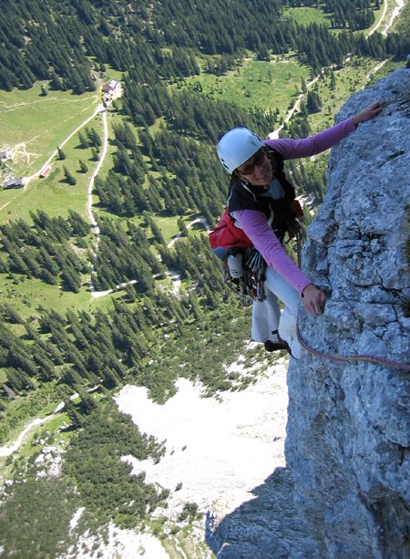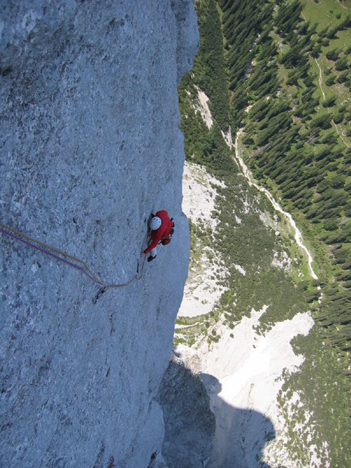 Alpinistisch sehr empfehlenswert! – Ohne weiteres kann man die Kletterwege in der Gimpel Nordwand mit großen Dolomitenrouten vergleichen. Der wichtigste positive Unterschied ist die Absicherung mit Bohrhaken.