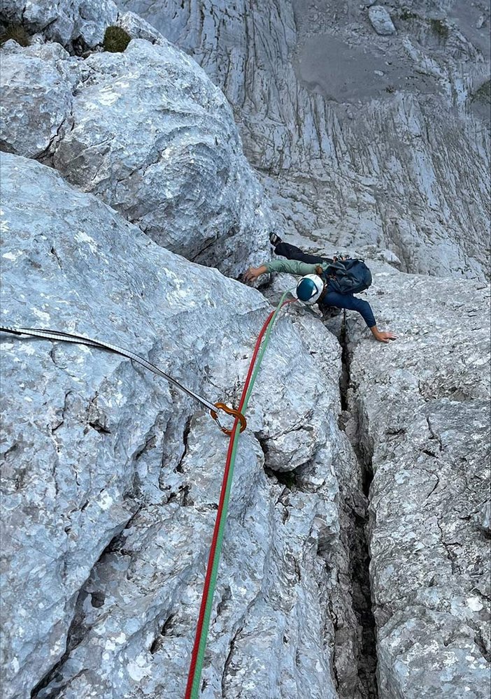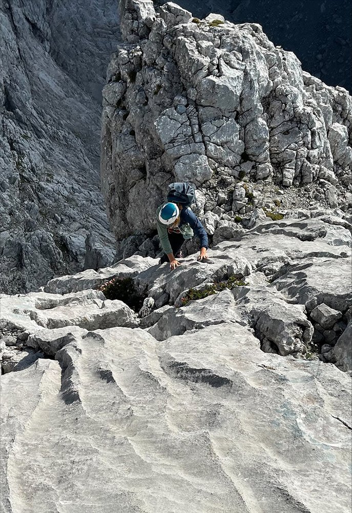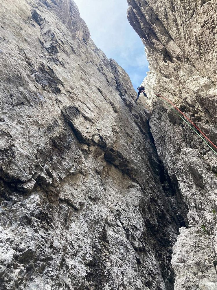 Auf den flachen Mittelgipfel rauf und zum Botzkamin einmal 20m abseilen. Mit dem Fixseil in den Botzkamin absteigen und von dort an den eingerichteten Abseilringen 3-4mal Abseilen. Auf den markierten Absteig zurück zum Rucksackdepot.