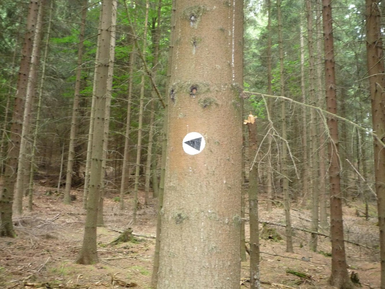 Vom Parkplatz in den Nun auf dem Wanderweg (grün) in den Schießgrund bald links (schwarzer Pfeil = Klettergebiet Markierung) zum Falkenstein. Wer von Ostrau kommt, steigt über das Klüfterl zum Schießgrund ab.