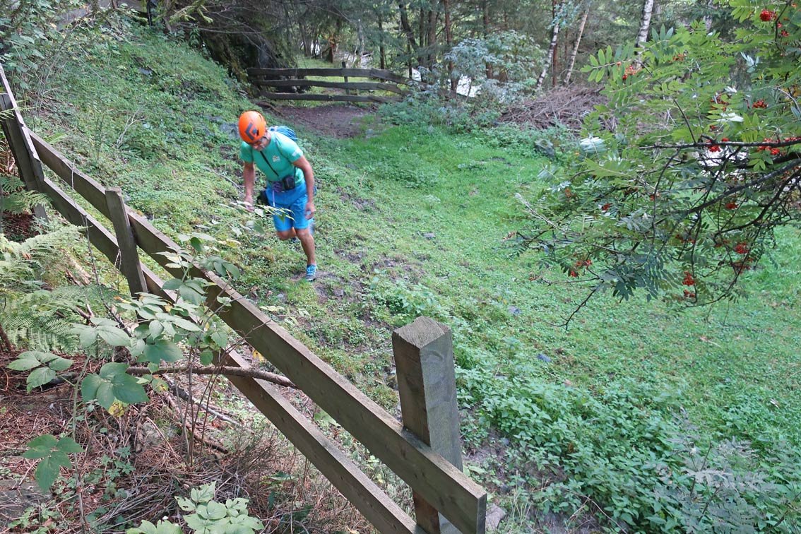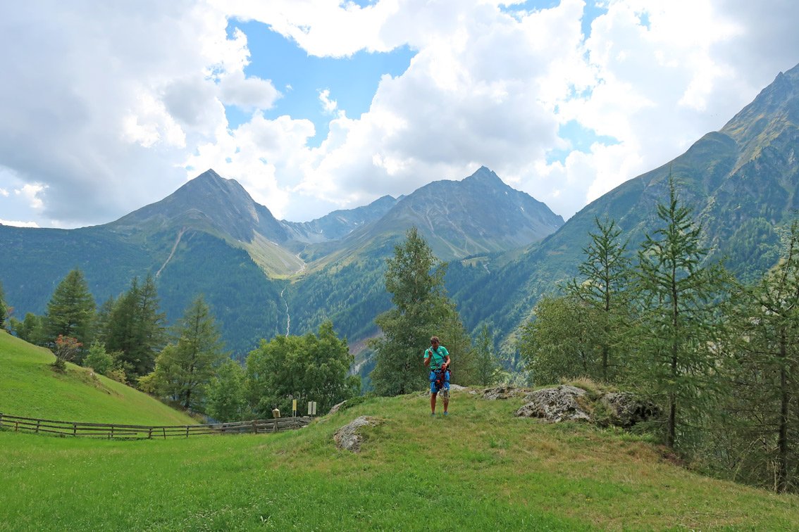 Vom Ausstieg der Tour nach rechts zum Zaun, dort beginnt der Abstiegsweg vom Klettersteig. Auf diesem entlang des Zauns zur Wiese und auf dem Forstweg links nach Längenfeld und von dort wieder zum Parkplatz.