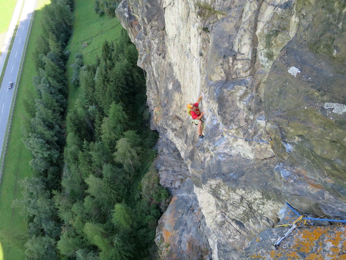 Eine im unteren Teil gigantisch ausgesetzte Mehrseillängentour an der sogenannten Burgsteinwand bei Längenfeld im Ötztal. Die Tour gehört zu den Klassikern im Ötztal. Wer eine 7er Seillänge sehr solide klettern kann, sollte sich dieses ausgesetzte Kletterabenteuer an einem sehr trockenen Tag unbedingt einmal anschauen, die mächtigen Überhänge sind ein Hit!