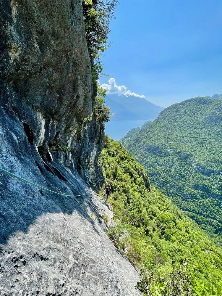 Die Seconda ondata ist eine von den Erstbegehern wirklich gut gefundene Linie an der Südwestseite der Cima Capi. Die Route verläuft über Platten, Plattenrampen und im oberen Teil an steilen, teilweise plattigen Aufschwüngen bis fast hinauf zur Ferrata Susatti. Gesamt ein schönes, längeres Kletterabenteuer mit abwechslungsreicher Kletterei und perfektem Blick auf den Gardasee!