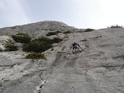 siehe Topo, Die Tour bewegt sich mit Ausnahme der letzten Seillängen über Platten. In der 9. und 11. Seillänge gibt es Wandkletterei, in der 10. Seillänge einen kleinen Überhang.