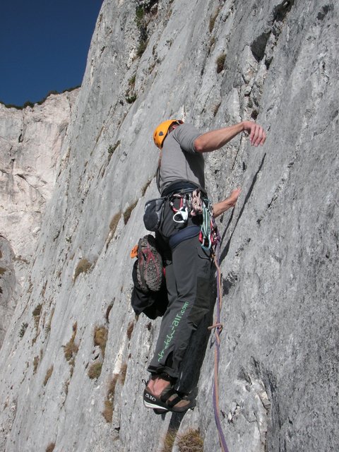 Absicherung ist ausgezeichnet. Trotzdem muss man zwischen den Haken schon selbst klettern. Mit nur A0 geht nichts.