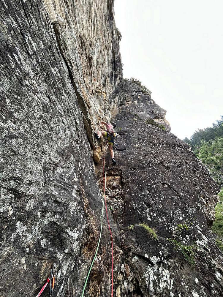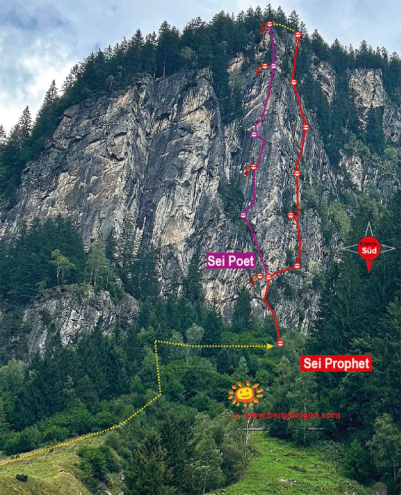 Von der Straße rauf zum Bauernhof und von dort der Straße kurz folgen und dann steil über die Wiesen rauf zur Wand. Im Wald kommt ein recht guter Weg, dem bis zum Einstieg folgen. Man läuft recht weit noch an vielen verschiedenen Routen vorbei bis man bei Sei Prophet ist, evtl. nochmal das Foto von der Einstiegslänge checken, damit man nicht in die falsche Tour einsteigt.